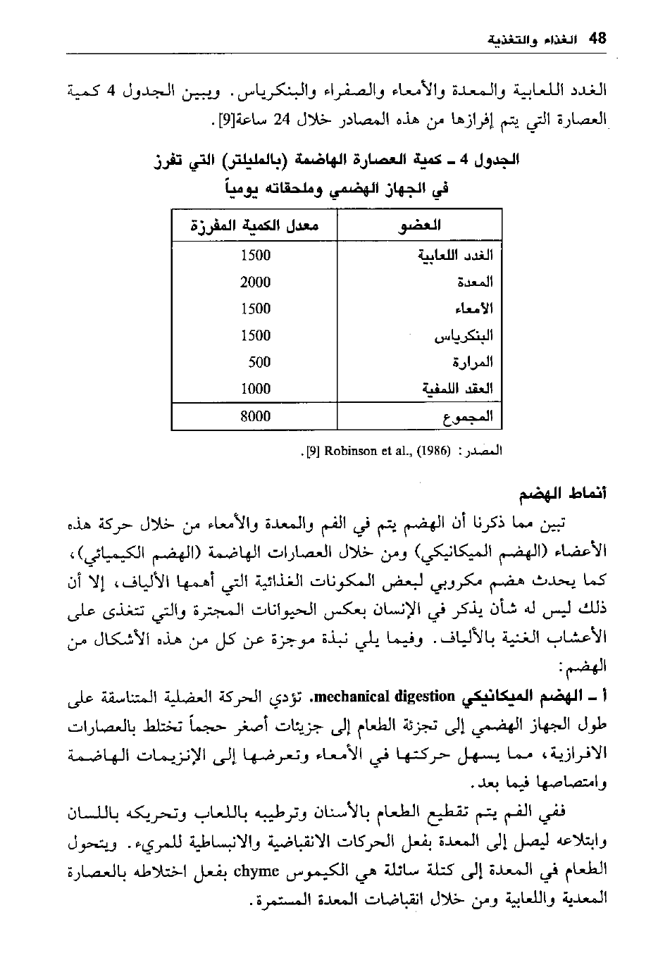 الغدد اللعابية والمعدة والأمعاء والصفراء والبنكرياس. ويبين الجدول 4 كمية العصارة التي يتم إفرازها من هذه المصادر خلال 24 ساعة [9] .