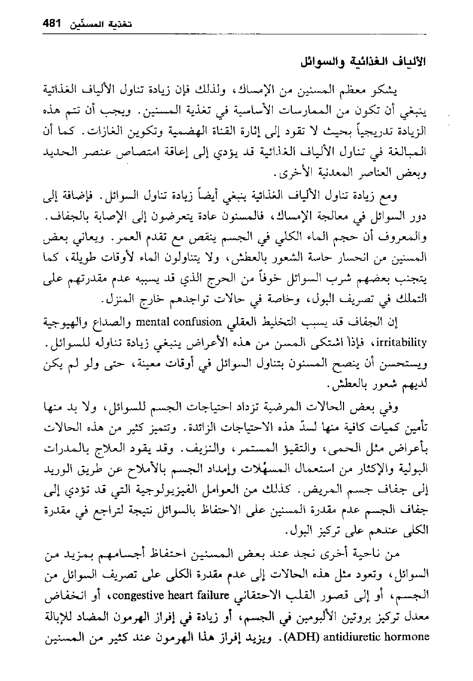 إن الجفاف قد يسبب التخليط العقلي mental confusion والصداع والهيوجية irritability فإذا اشتكى المسن من هذه الأعراض ينبغي زيادة تناوله للسوائل ويستحسن أن ينصح المسنون بتناول السوائل في أوقات معينة، حتى ولو لم يكن لديهم شعور بالعطش.