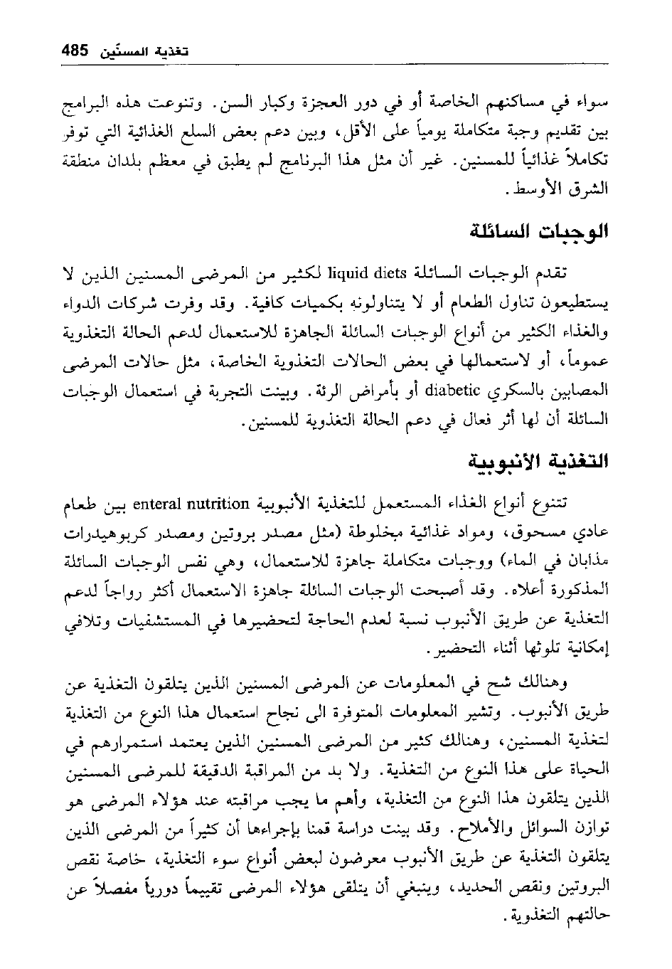 وهنالك شح في المعلومات عن المرضى المسنين الذين يتلقون التغذية عن طريق الأنبوب. وتشير المعلومات المتوفرة إلى نجاح استعمال هذا النوع من التغذية لتغذية المسنين، وهنالك كثير من المرضى المسنين الذين يعتمد استمرارهم في الحياة على هذا النوع من التغذية. ولا بد من المراقبة الدقيقة للمرضى المسنين الذين يتلقون هذا النوع من التغذية، وأهم ما يجب مراقبته عند هؤلاء المرضى هو توازن السوائل والأملاح. وقد بينت دراسة قمنا بإجرائها أن كثيرا من المرضى الذين يتلقون التغذية عن طريق الأنبوب معرضون لبعض أنواع سوء التغذية، خاصة نقص البروتين ونقص الحديد، وينبغي أن يتلقى هؤلاء المرضى تقييما دوريا مفصلا عن حالتهم التغذوية.