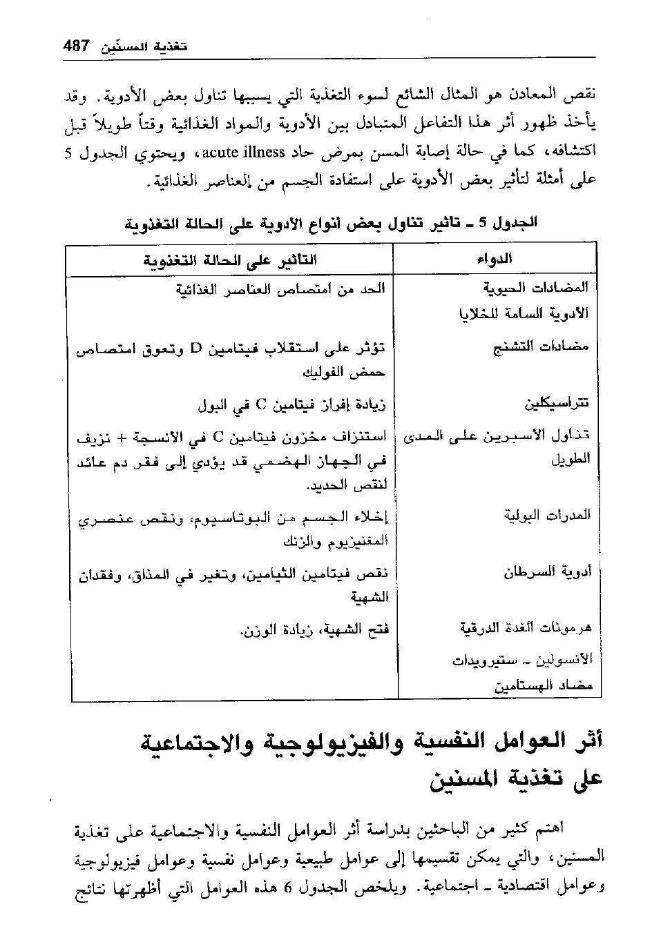 نقص المعادن هو المثال الشائع لسوء التغذية التي يسببها تناول بعض الأدوية وقد يأخذ ظهور أثر هذا التفاعل المتبادل بين الأدوية والمواد الغذائية وقتا طويلا قبل اكتشافه، كما في حالة إصابة المسن بمرض حاد acute illness، ويحتوي الجدول 5 على أمثلة لتأثير بعض الأدوية على استفادة الجسم من العناصر الغذائية.
