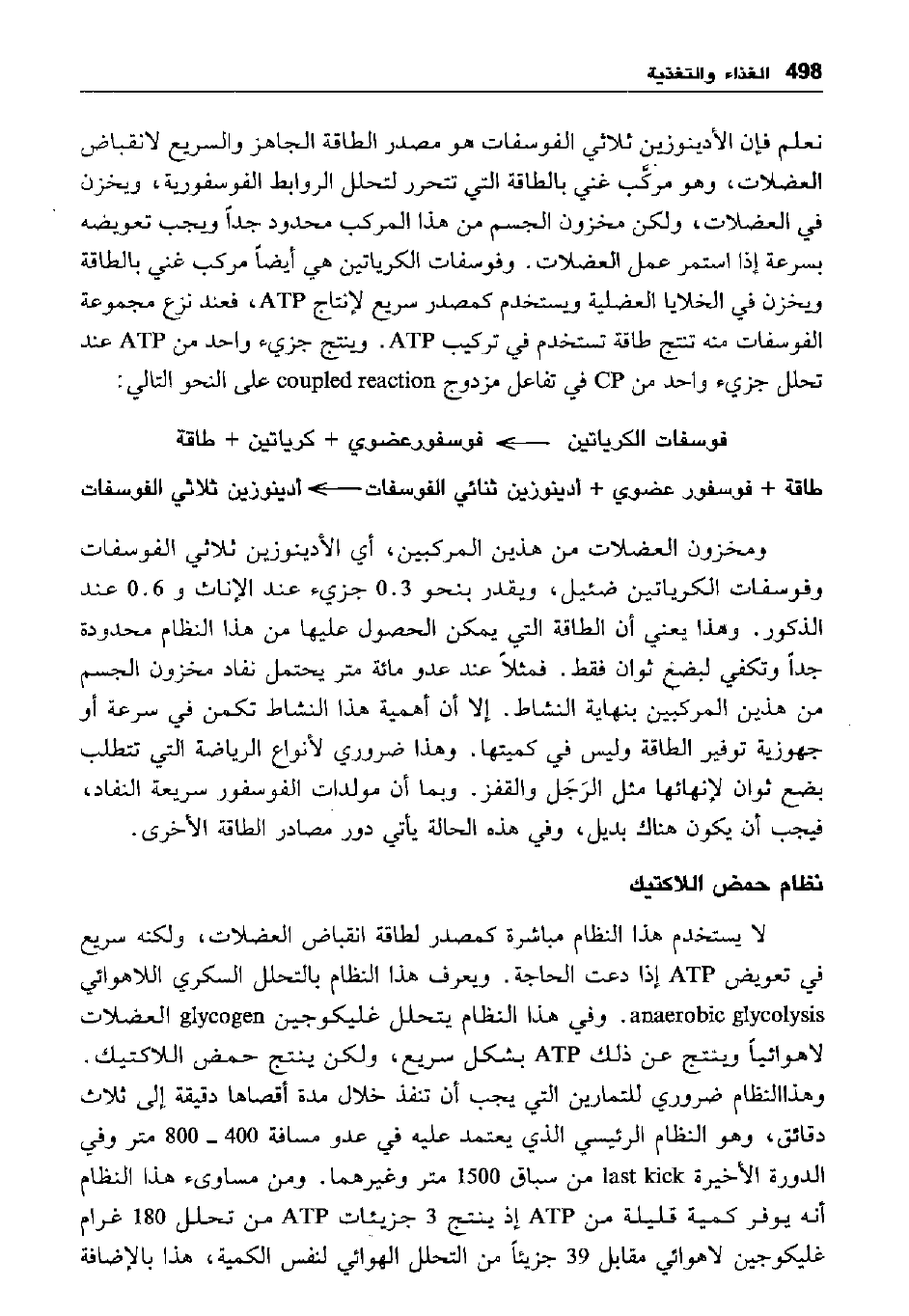 نعلم فإن الأدينوزين ثلاثي الفوسفات هو مصدر الطاقة الجاهز والسريع لانقباض العضلات، وهو مركب غني بالطاقة التي تتحرر لتحل الروابط الفوسفورية، ويخزن في العضلات، ولكن مخزون الجسم من هذا المركب محدود جدًّا ويجب تعويضه بسرعة إذا استمرعمل العضلات. وفوسفات الكرياتين هي أيضا مركب غني بالطاقة ويخزن في الخلايا العضلية ويستخدم كمصدر سريع لإنتاج ATP، فعند نزع مجموعة الفوسفات منه تنتج طاقة تستخدم في تركيب ATP. وينتج جزء واحد من ATP عند تحلل جزيء واحد من CP في تفاعل مزدوج coupled reaction على النحو التالي: