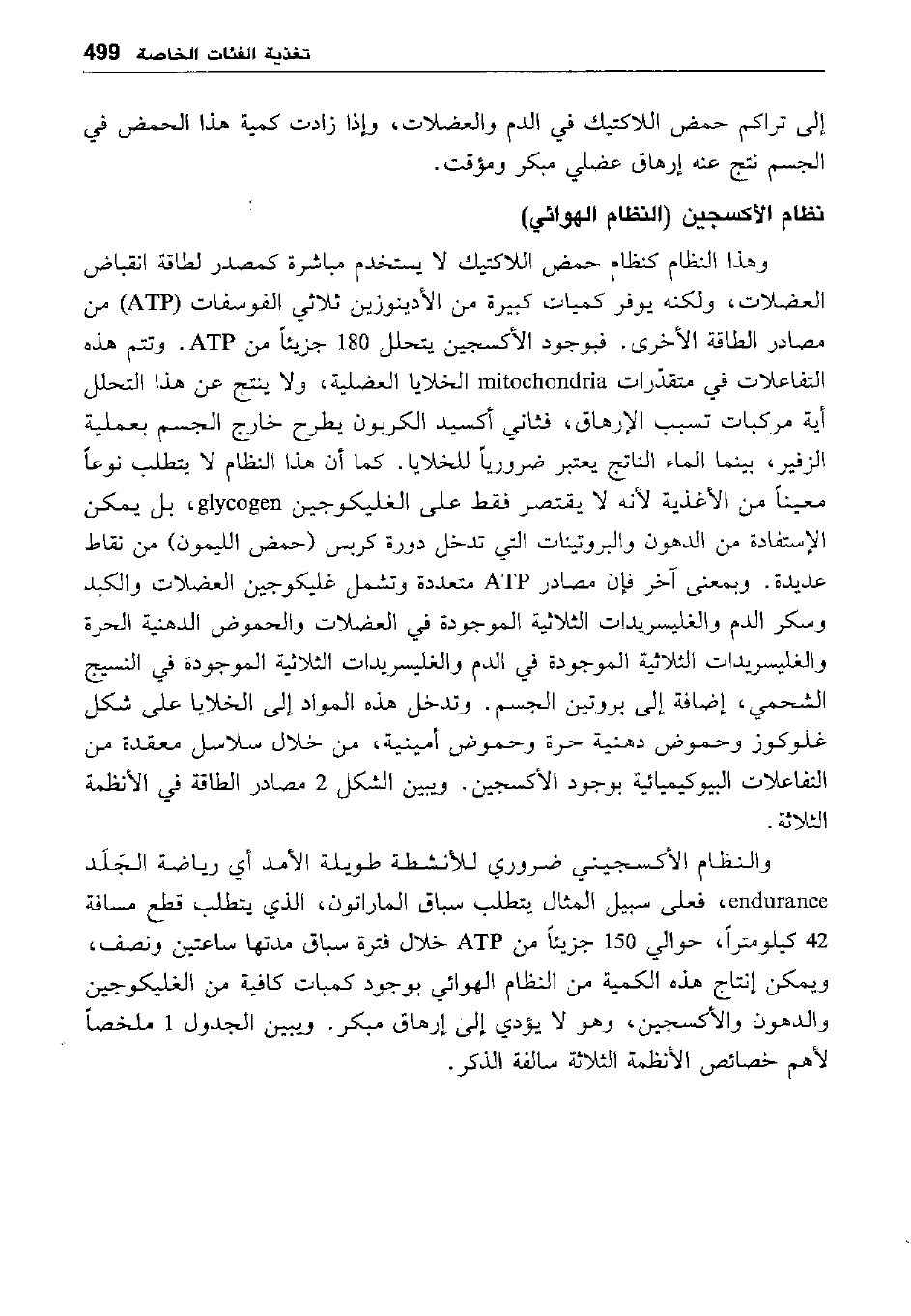 والنظام الأكسجيني ضروري للأنشطة طويلة الأمد أي رياضة الجلد endurance، فعلى سبيل المثال يتطلب سباق الماراتون، الذي يتطلب قطع مسافة 42 كيلو مترا، حوالي 150 جزئيا من ATP خلال فترة سباق مدتها ساعتين ونصف، ويمكن إنتاج هذه الكمية من النظام الهوائي بوجود كميات كافية من الغليكوجين والدهون والأكسجين، وهو لا يؤدي إلى إرهاق مبكر. ويبين الجدول 1 ملخصا لأهم خصائص الأنظمة الثلاثة سالفة الذكر.