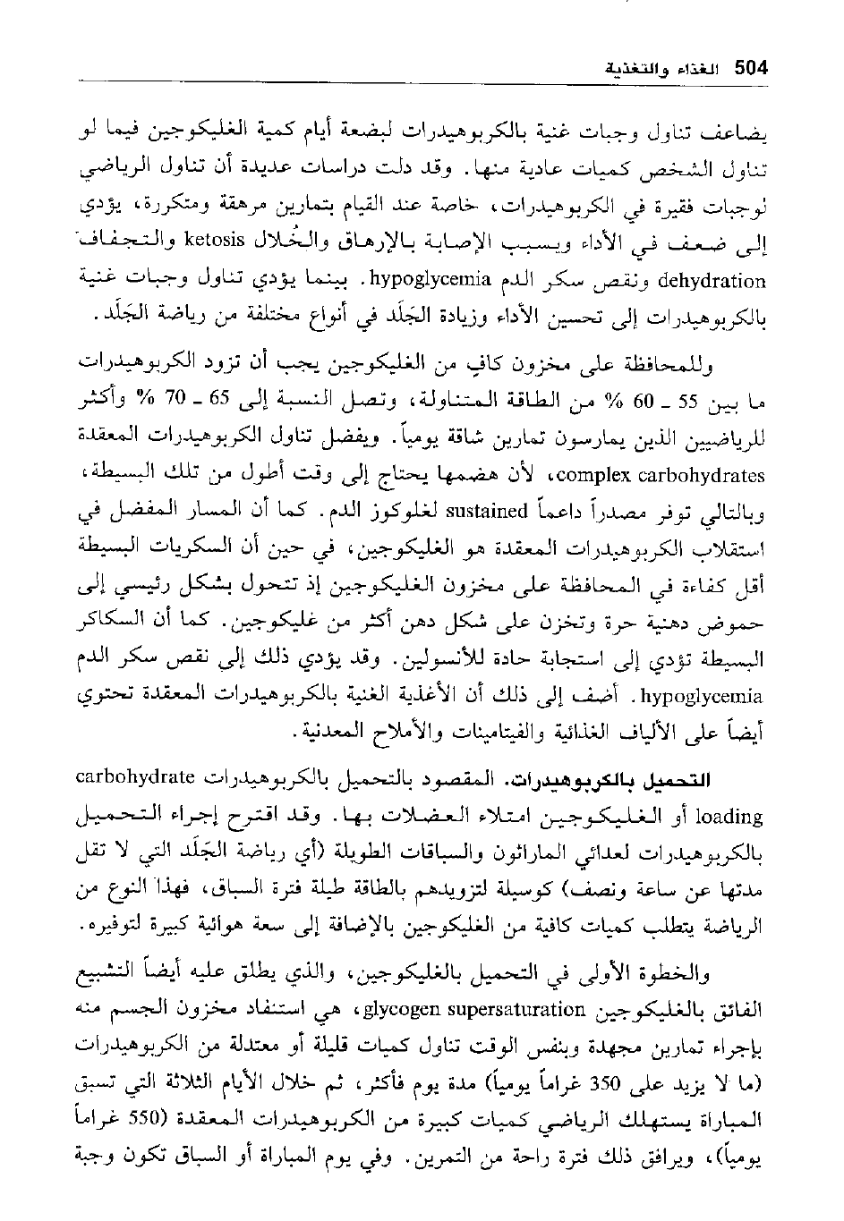 التحميل بالكربوهيدرات. المقصود بالتحميل بالكربوهيدرات carbohydrate loading أو الغليكوجين امتلاء العضلات بها. وقد اقترح إجراء التحميل بالكربوهيدرات لعدائي الماراثون والسابقات الطويلة "اي رياضة الجلد التي لا تقل مدتها عن ساعة ونصف" كوسيلة لتزويدهم بالطاقة طيلة فترة السباق، فهذا النوع من الرياضة يتطلب كميات كافية من الغليكوجين بالإضافة إلى سعة هوائية كبيرة لتوفيره.