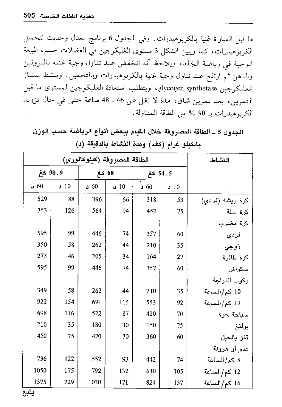 الجدول 5- الطاقة المصروفة خلال القيام ببعض أنواع الرياضة حسب الوزن بالكيلو غرام "كغم" ومدة النشاط الدقيقة "د"