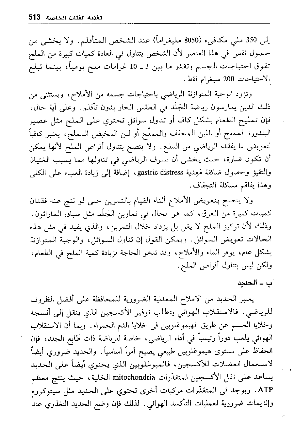 وتزود الوجبة المتوازنة الرياضي باحتياجات جسمه من الأملاح، ويستثنى من ذلك الذين يمارسون رياضة الجلد في الطقس الحار بدون تأقلم. وعلى أية حال، فإن تمليح الطعام بشكل كاف أو تناول سوائل تحتوي على الملح مثل عصير البندورة المملح أو اللبن المخفف والمملح أو لبن المخيض المملح، يعتبر كافيا لتعويض ما يفقده الرياضي من الملح. ولا ينصح بتناول أقراص الملح لأنها يمكن أن تكون ضارة، حيث يخشى أن يسرف الرياضي في تناولها مما يسبب الغثيان والتقيؤ وحصول ضائقة معدية GASTRIC DISTRESS إضافة إلى زيادة العبء على الكلى وهذا يفاقم مشكلة التجفاف.
