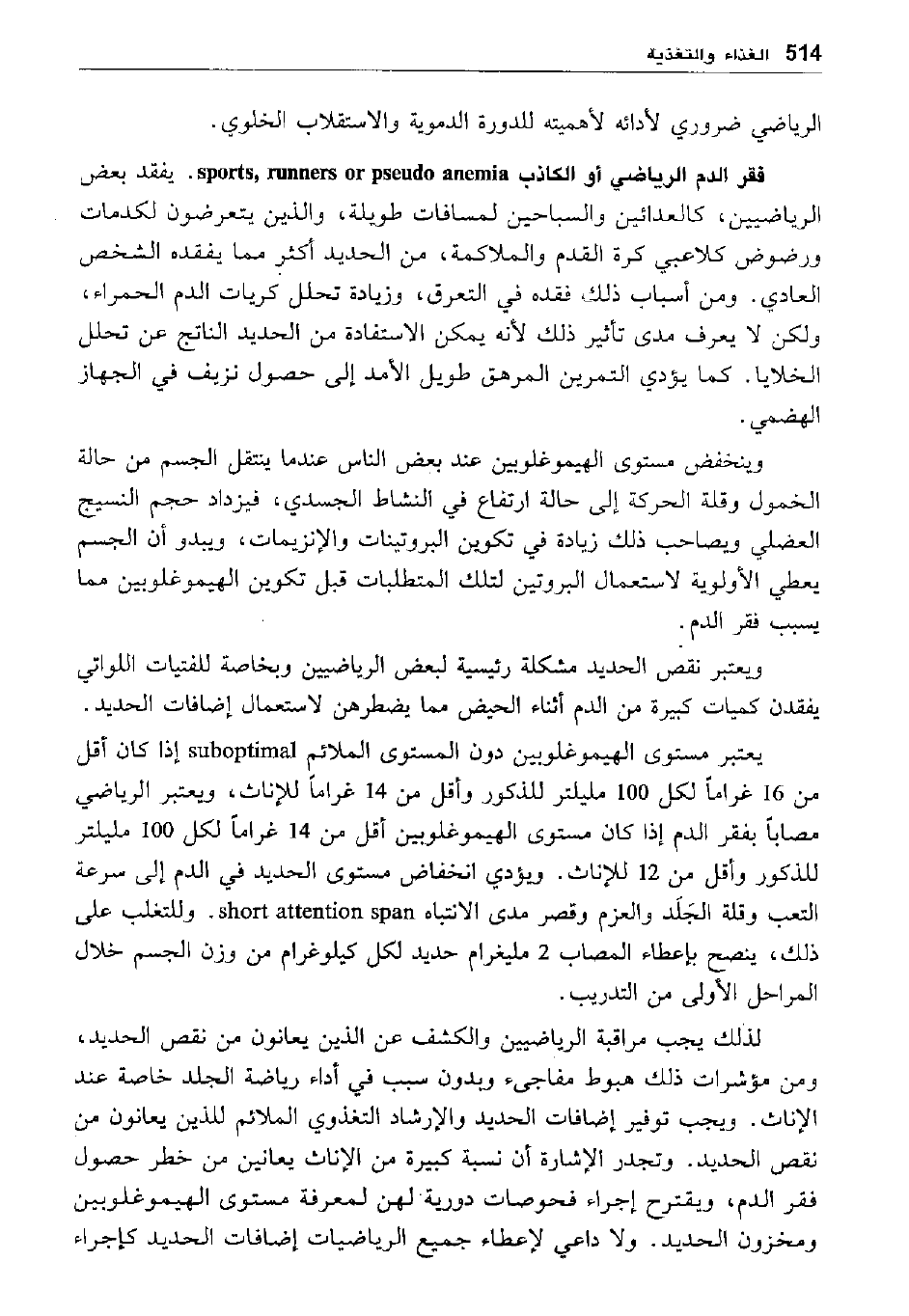 يعتبر مستوى الهيموغلوبين دون المستوى الملائم SUPOPTIMAL إذا كان أقل من 16 غراما لكل 100 مليلتر للذكور وأقل من 14 غراما للإناث، ويعتبر الرياضي مصابا بفقر الدم إذا كان مستوى الهيموغلوبين أقل من 14 غراما لكل 100 مليلتر للذكور وأقل من 12 للإناث. ويؤدي انخفاض مستوى الحديد في الدم إلى سرعة التعب وقلة الجلد والعزم وقصر مدى الانتباه Short attention span وللتغلب على ذلك. ينصح بإعطاء المصاب 2 مليغرام حديد لكل كيلو غرام من وزن الجسم خلال المراحل الأولى من التدريب.