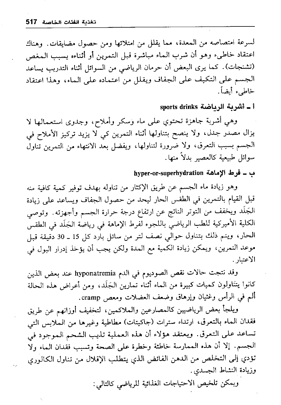 لسرعة امتصاصه من المعدة، مما يقلل من امتلائها ومن حصول مضايقات. وهناك اعتقاد خاطئ وهو أن شرب الماء مباشرة قبل التمرين أو أثناءه يسبب المغص "تشجنات" كما يرى البعض أن حرمان الرياضي من السوائل أثناء التدريب يساعد الجسم على التكيف على الجفاف ويقلل من اعتماده على الماء، وهذا اعتقاد خاطئ أيضا.