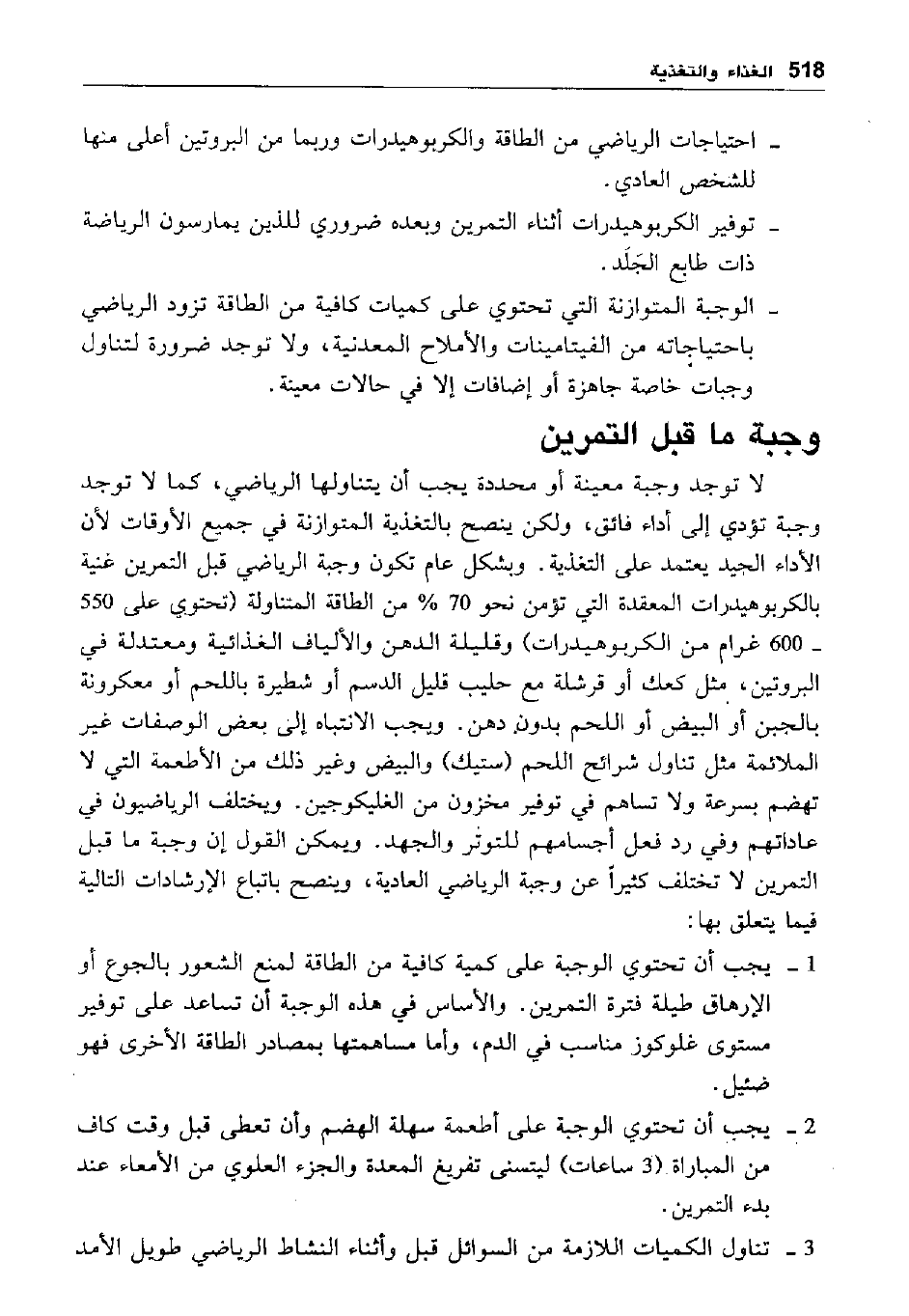 2- يجب أن تحتوي الوجبة على أطعمة سهلة الهضم وأن تعطى قبل وقت كاف من المباراة "3 ساعات" ليتسنى تفريغ المعدة والجزء العلوي من الأمعاء عند بدء التمرين.