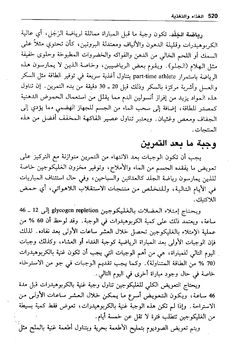 ويحتاج امتلاء العضلات بالغليكوجين glycogen repletion إلى 12- 46 ساعة، ويعتمد ذلك على كمية الكربوهيدرات في الوجبة. وقد لوحظ أن 60% من عملية الامتلاء بالغليكوجين تحصل خلال العشر ساعات الأولى بعد نفاده. لذلك فإن الوجبات الأولى بعد المباراة الرياضية كوجبة الغداء أو العشاء، وكذلك وجبات اليوم التالي للمباراة، هي من أهم الوجبات التي يجب أن تكون غنية بالكربوهيدرات "70% من الطاقة المتناولة". وكما يجب تقديم الوجبات في جو من الاسترخاء خاصة في حال وجود مباراة أخرى في اليوم التالي.