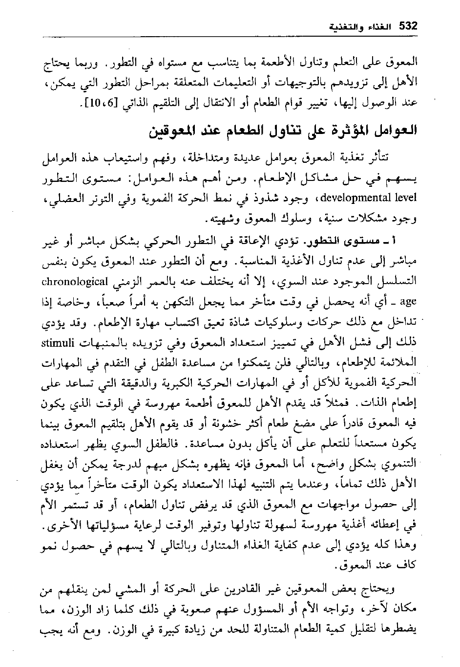 أ- مستوى التطور: تؤدي الإعاقة في التطور الحركي بشكل مباشر أو غير مباشر إلى عدم تناول الأغذية المناسبة. ومع أن التطور عند المعوق يكون بنفس التسلسل الموجود عند السوي، إلا أنه يختلف عنه بالعمر الزمني CHRONOLOGICAL AGE أي أنه يحصل في وقت متأخر مما يجعل التكهن به أمرا صعبا، وخاصة إذا تداخل مع ذلك حركات وسلوكيات شادة تعيق اكتساب مهارة الإطعام. وقد يؤدي ذلك إلى فشل الأهل في تمييز استعداد المعوق وفي تزويده بالمنبهات Stimuli الملائمة للإطعام، وبالتالي فلن يتمكنوا من مساعدة الطفل في التقدم في المهارات الحركية الفموية للأكل أو في المهارات الحركية الكبرية والدقيقة التي تساعد على إطعام الذات. فمثلا قد يقدم الأهل للمعوق أطعمة مهروسة في الوقت الذي يكون فيه المعوق قادرا على مضغ طعام أكثر خشونة أو قد يقوم الأهل بتلقيم المعوق بينما يكون مستعدا للتعلم على أن يأكل بدون مساعدة. فالطفل السوي يظهر استعداده التنموي بشكل واضح، أما المعوق فإنه يظهره بشكل مبهم لدرجة يمكن أن يغفل الأهل ذلك تماما، وعندما يتم التنبيه لهذا الاستعداد يكون الوقت متأخرا مما يؤدي إلى حصول مواجهات مع المعوق الذي قد يرفض تناول الطعام، أو قد تستمر الأم في إعطائه أغذية مهروسة لسهولة تناولها وتوفير الوقت لرعاية مسؤلياتها الأخرى وهذا كله يؤدي إلى عدم كفاية الغذاء المتناول وبالتالي لا يسهم في حصول نمو كاف عند المعوق.
