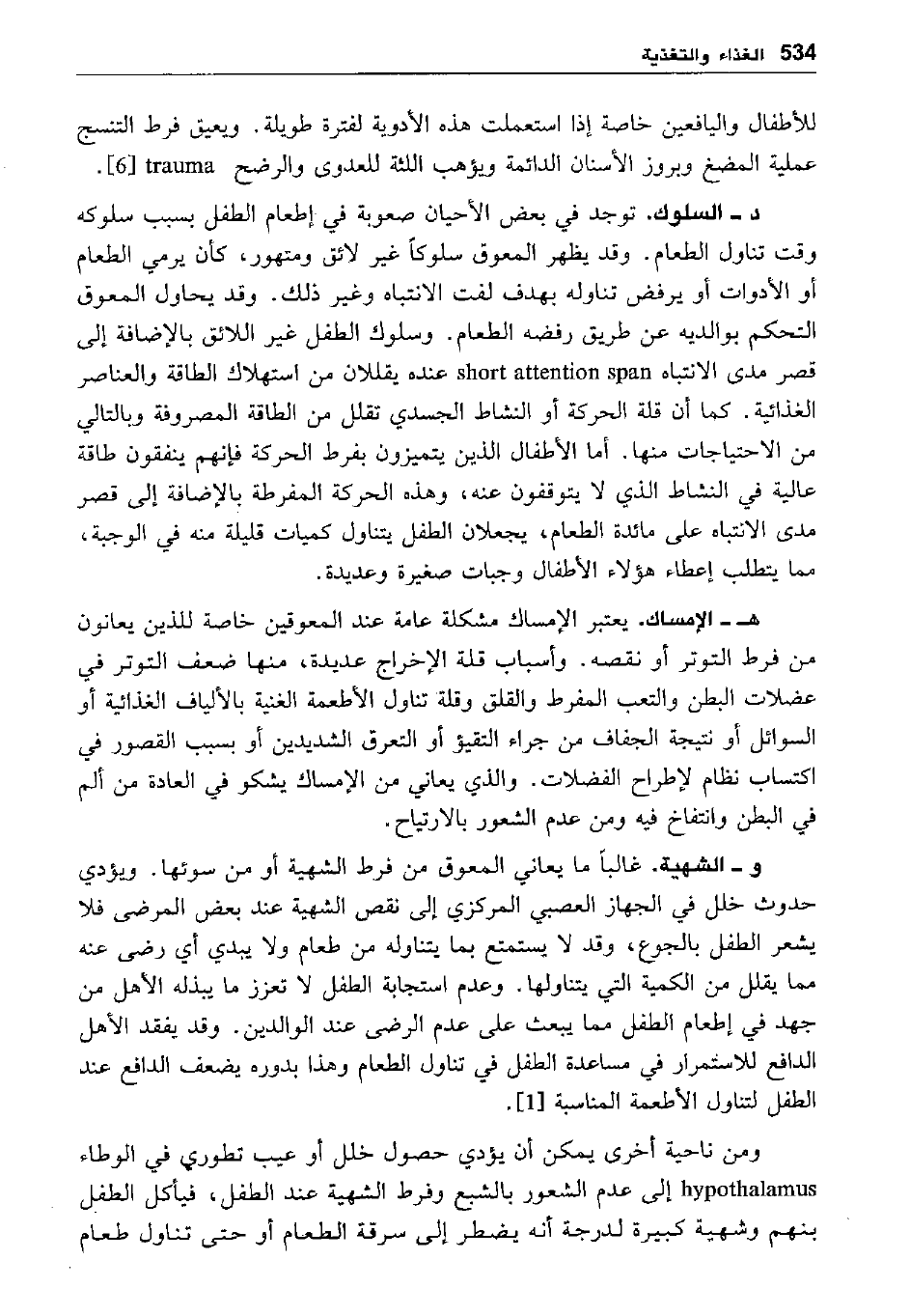 و الشهية: غالبا ما يعاني المعوق من فرط الشهية أو من سوئها. ويؤدي حدوث خلل في الجهاز العصبي المركزي إلى نقص الشهية عند بعض المرضى فلا يشعر الطفل بالجوع، وقد لا يستمتع بما يتناوله من طعام ولا يبدي أي رضى عنه مما يقلل من الكمية التي يتناولها. وعدم استجابة الطفل لا تعزز ما يبذله الأهل من جهد في إطعام الطفل مما يبعث على عدم الرضى عند الوالدين. وقد يفقد الأهل الدافع للاستمرار في مساعدة الطفل في تناول الطعام وهذا بدوره يضعف الدافع عند الطفل لتناول الأطعمة المناسبة [1] .