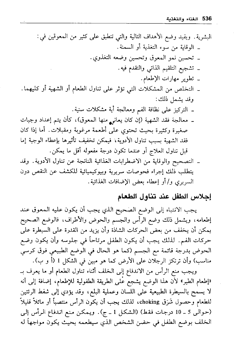 يجب الانتباه إلى الوضع الصحيح الذي يجب أن يكون عليه المعوق عند إطعامه، ويشمل ذلك وضع الرأس والجسم والحوض والأطراف، فالوضع الصحيح يمكن أن يخفف من بعض الحركات الشاذة وأن يزيد من القدرة على السيطرة على حركات الفم. لذلك يجب أن يكون الطفل مرتاحا في جلوسه وأن يكون وضع الحوض بدرجة قائمة مع الجسم "كما هو الحال في الوضع الطبيعي فوق كرسي مناسب" وأن ترتكز الرجلان على الأرض كما هو مبين في الشكل "أوب ".