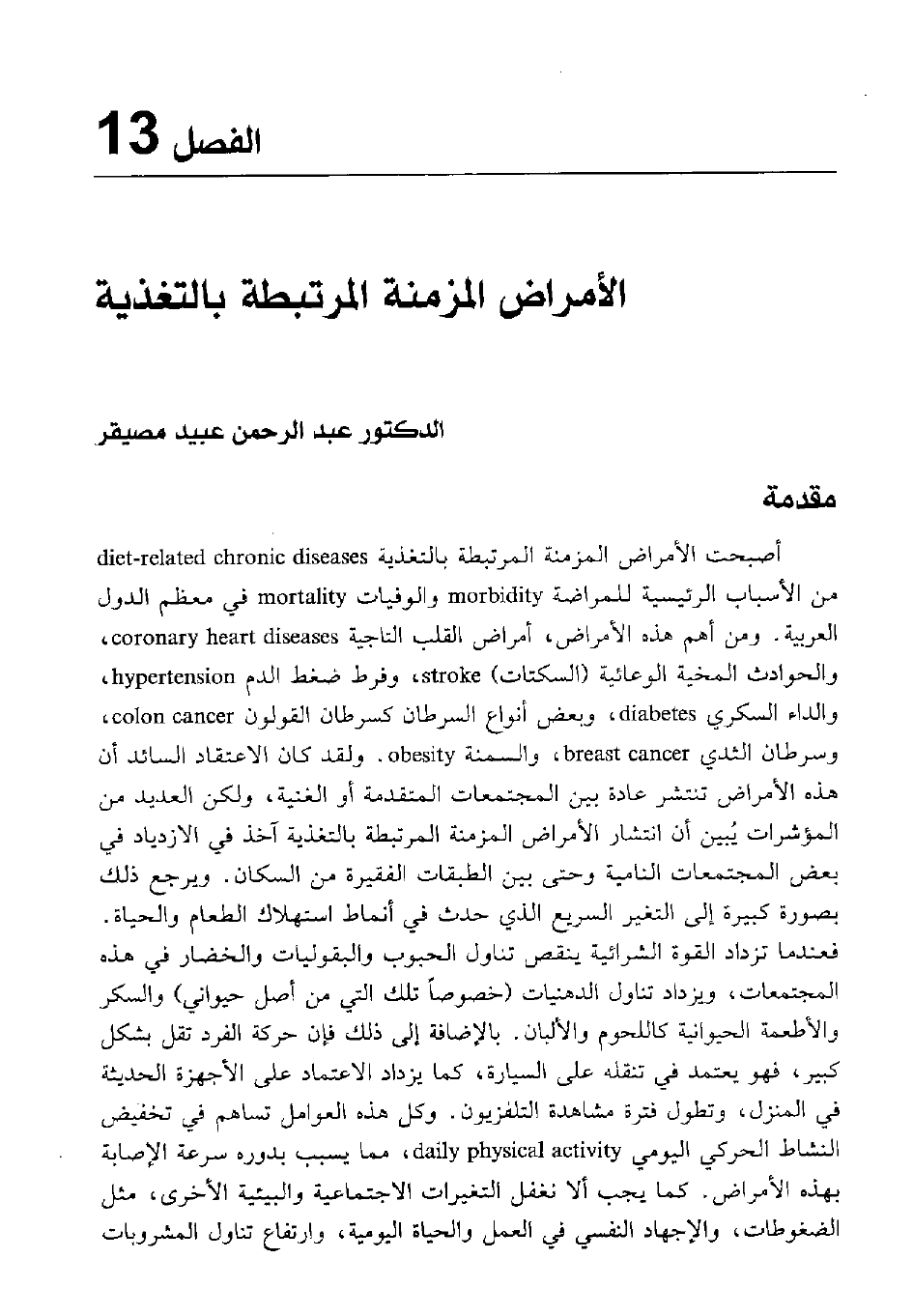 أصبحت الأمراض المزمنة المرتبطة بالتغذية diet-related chronic diseases من الأسباب الرئيسية للمراضة morbidity والوفيات morrtality في معظم الدول العربية. ومن أهم الأمراض، أمراض القلب التاجية Coronary heart diseases والحوادث المخية الوعائية "السكتات" stroke، وفرط ضغط الدم hypertension والداء السكري diabetes وبعض أنواع السرطان كسرطان القولون colon cancer وسرطان الثدي breast cancer، والسمنة obesity ولقد كان الاعتقاد السائد أن هذه الأمراض تنتشر عادة بين المجتمعات المتقدمة أو الغنية، ولكن العديد من المؤشرات يبين أن انتشار الأمراض المزمنة المرتبطة بالتغذية آخذ في الازدياد في بعض المجتمعات النامية وحتى بين الطبقات الفقيرة من السكان. ويرجع ذلك بصورة كبيرة إلى التغير السريع الذي حدث في أنماط استهلاك الطعام والحياة. فعندما تزداد القوة الشرائية ينقص تناول الحبوب والبقوليات والخضار في هذه المجتمعات، ويزداد تناول الدهنيات "خصوصا تلك التي من أصل حيواني" والسكر والأطعمة الحيوانية كاللحوم والألبان. بالإضافة إلى ذلك فإن حركة الفرد تقل بشكل كبير، فهو يعتمد في تنقله على السيارة، كما يزداد الاعتماد على الأجهزة الحديثة في المنزل، وتطول فترة مشاهدة التلفزيون، وكل هذه العوامل تساهم في تخفيض النشاط الحركي اليومي Daily physical activity، مما يسبب بدوره سرعة الإصابة بهذه الأمراض. كما يجب ألا نغفل التغيرات الاجتماعية والبيئية الأخرى، مثل الضغوطات، والإجهاد النفسي في العمل والحياة اليومية، وارتفاع تناول المشروبات الكحولية في بعض البلدان العربية، وازدياد نسبة المدخنين خاصة بين الشباب والمراهقين، والتلوث البيئي، وتعتبر هذه من عوامل الخطر الرئيسية لبعض هذه الأمراض. ويستعرض هذا الفصل أهم الأمراض المزمنة المرتبطة بالتغذية وعوامل الخطر المؤدية إليها وبعض الإجراءات الوقائية لتقليل الإصابة.