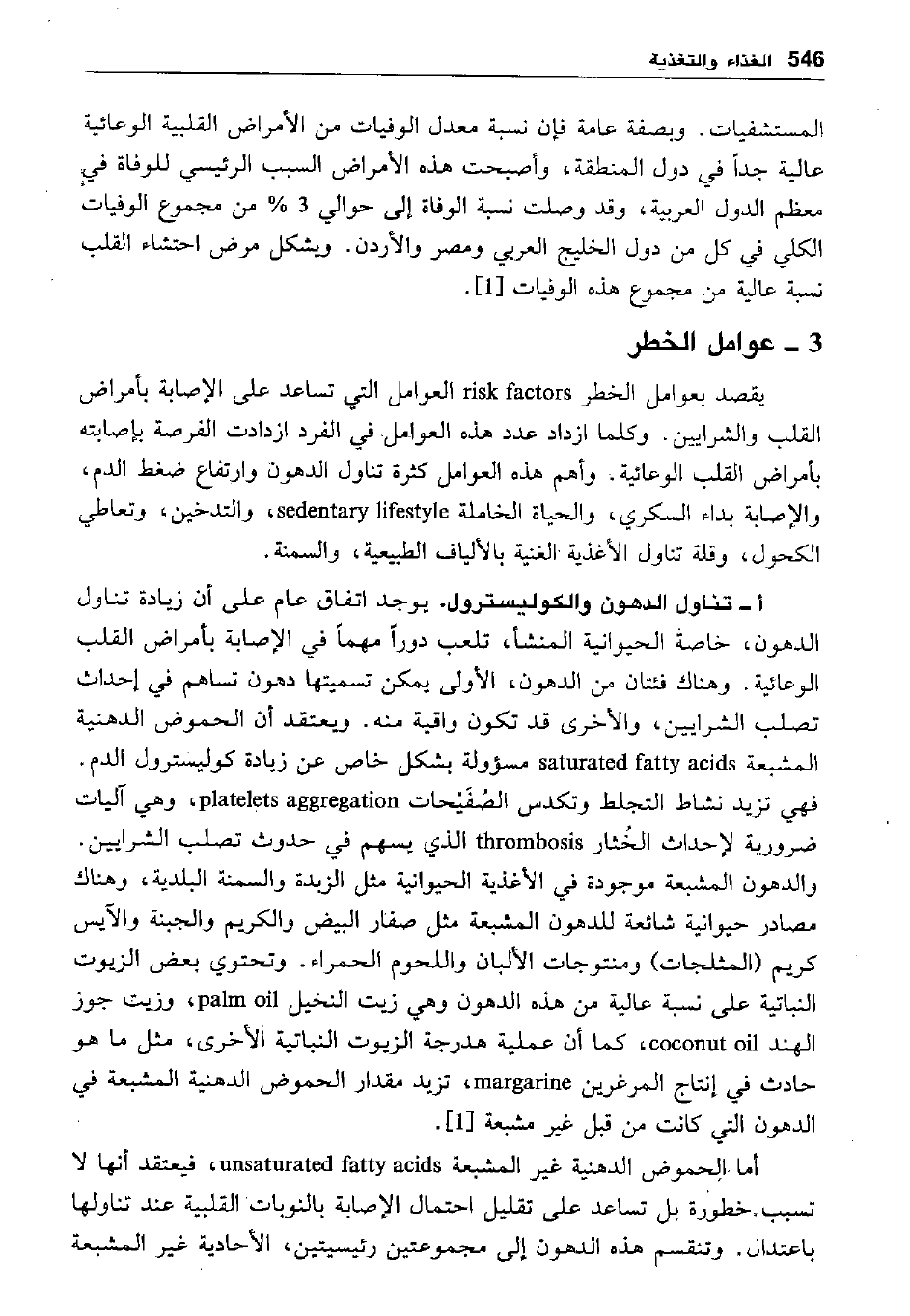 أ- تناول الدهون والكوليسترول: يوجد اتفاق عام على أن زيادة تناول الدهون، خاصة الحيوانية المنشأ، تلعب دورا مهما في الإصابة بأمراض القلب الوعائية. وهناك فئتان من الدهون. الأولى يمكن تسميتها دهون تساهم في إحداث تصلب الشرايين، والأخرى قد تكون واقية منه. ويعتقد أن الحموض الدهنية المشبعة saturated fatty acids مسؤولة بشكل خاص عن زيادة كوليسترول الدم فهي تزيد نشاط التجلط وتكدس الصفيحات platelets aggregation، وهي آليات ضرورية لإحداث الخثار thrombosis الذي يسهم في حدوث تصلب الشرايين. والدهون المشبعة موجودة في الأغذية الحيوانية مثل الزبدة والسمنة البلدية، وهناك مصادر حيوانية شائعة للدهون المشبعة مثل صفار البيض والكريم والجبنة والآيس كريم "المثلجات" ومنتوجات الألبان واللحوم الحمراء. وتحتوي بعض الزيوت النباتية على نسبة عالية من هذه الدهون وهي زيت النخيل palm oil، وزيت جوز الهند coconut oil، كما أن عملية هدرجة الزيوت النباتية الأخرى، مثل ما هو حادث في إنتاج المرغرين margarine تزيد مقدار الحموض الدهنية المشبعة في الدهون التي كانت من قبل غير مشبعة [1] .