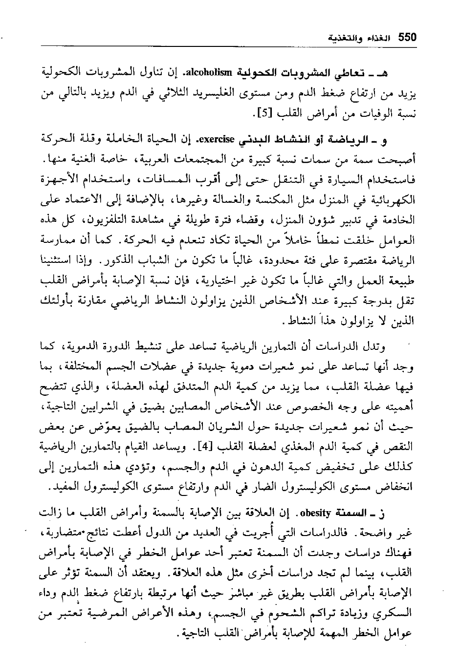 هـ- تعاطي المشروبات الكحولية alcoholism: إن تناول المشروبات الكحولية يزيد من ارتفاع ضغط الدم ومن مستوى الغليسريد الثلاثي في الدم ويزيد بالتالي من نسبة الوفيات من أمراض القلب [5] .