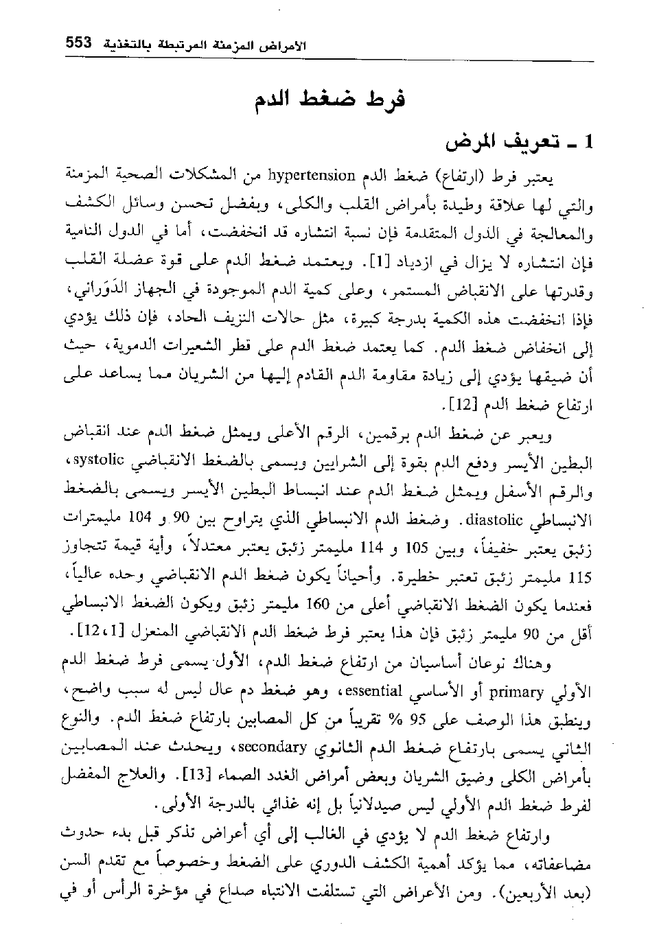 وهناك نوعان أساسيان من ارتفاع ضغط الدم، الأول يسمى فرط ضغط الدم الأولي primary أو الأساسي essential، وهو ضغط دم عال ليس له سبب واضح، وينطبق هذا الوصف على 95% تقريبا من كل المصابين بارتفاع ضغط الدم. والنوع الثاني يسمى بارتفاع ضغط الدم الثانوي secondary ويحدث عند المصابين بأمراض الكلى وضيق الشريان وبعض أمراض الغدد الصماء [113] . والعلاج المفضل لفرط ضغط الدم الأولي ليس صيدلانيا بل إنه غذائي بالدرجة الأولى.