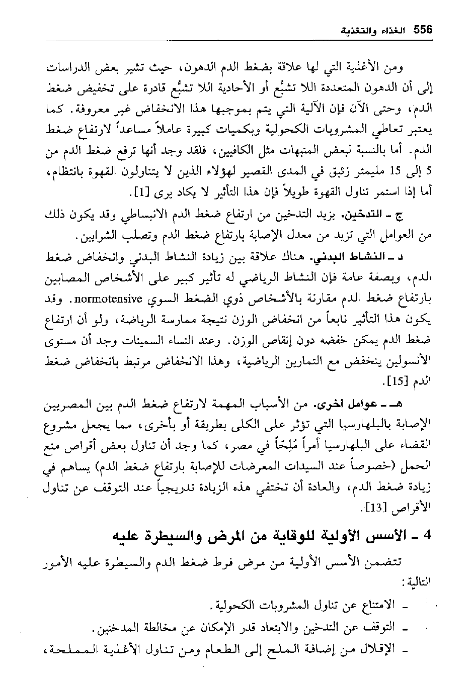 د- النشاط البدني: هناك علاقة بين زيادة النشاط البدني وانخفاض ضغط الدم، وبصفة عامة فإن النشاط الرياضي له تأثير كبير على الأشخاص المصابين بارتفاع ضغط الدم مقارنة بالأشخاص ذوي الضغط السوي NORMOTENSIVE وقد يكون هذا التأثير نابعا من انخفاض الوزن نتيجة ممارسة الرياضة، ولو أن ارتفاع ضغط الدم يمكن خفضه دون إنقاص الوزن. وعند النساء السمينات وجد أن مستوى الأنسولين ينخفض مع التمارين الرياضية، وهذا الانخفاض مرتبط بانخفاض ضط الدم [15] .