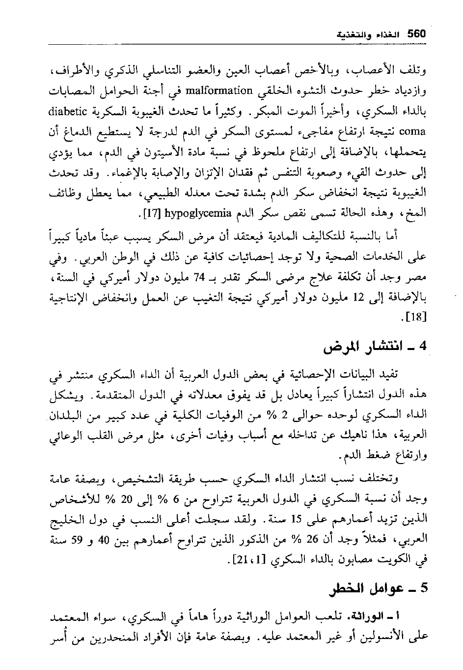 وتلف الأعصاب، وبالأخص أعصاب العين والعضو التناسلي الذكري والأطراف، وازدياد خطر حدوث التشوه الخلقي Malformation في أجنة الحوامل المصابات بالداء السكري، وأخيرا الموت المبكر. وكثيرا ما تحدث الغيبوبة السكرية diabetic coma نتيجة ارتفاع مفاجئ لمستوى السكر في الدم لدرجة لا يستطيع الدماغ أن يتحملها، بالإضافة إلى ارتفاع ملحوظ في نسبة مادة الأسيتون في الدم، مما يؤدي إلى حدوث القيء وصعوبة التنفس ثم فقدان الاتزان والإصابة بالإغماء. وقد تحدث الغيبوبة نتيجة انخفاض سكر الدم بشدة تحت معدله الطبيعي، مما يعطل وظائف المخ، وهذه الحالة تسمى نقص سكر الدم hypoglycemia [17] .