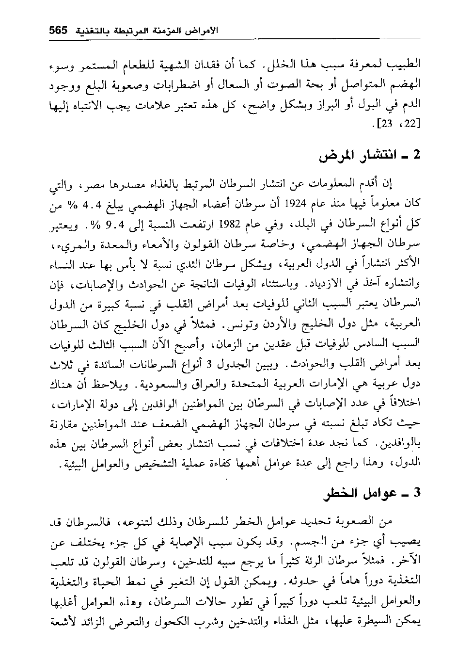 إن أقدم المعلومات عن انتشار السرطان المرتبط بالغذاء مصدرها مصر، والتي كان معلوما فيها منذ عام 1924 أن سرطان أعضاء الجهاز الهضمي يبلغ 4.4% من كل أنواع السرطان في البلد، وفي عام 1982 ارتفعت النسبة إلى 9.4% ويعتبر سرطان الجهاز الهضمي، وخاصة سرطان القولون والأمعاء والمعدة والمريء، الأكثر انتشارا في الدول العربية، ويشكل سرطان الثدي نسبة لا بأس بها عند النساء وانتشاره آخذ في الازدياد. وباستثناء الوفيات الناتجة عن الحوادث والإصابات، فإن السرطان يعتبر السبب الثاني للوفيات بعد أمراض القلب في نسبة كبيرة من الدول العربية، مثل دول الخليج والأردن وتونس. فمثلا في دول الخليج كان السرطان السبب السادس للوفيات قبل عقدين من الزمان، وأصبح الآن السبب الثالث للوفيات بعد أمراض القلب والحوادث. ويبين الجدول 3 أنواع من السرطانات السائدة في ثلاث دول عربية هي الإمارات العربية المتحدة والعراق والسعودية. ويلاحظ أن هناك اختلافا في عدد الإصابات في السرطان بين المواطنين الوافدين إلى دولة الإمارات، حيث تكاد تبلغ نسبته في سرطان الجهاز الهضمي الضعف عند المواطنين مقارنة بالوافدين. كما نجد عدة اختلافات في نسب انتشار بعض أنواع السرطان بين هذه الدول، وهذا راجع إلى عدة عوامل أهمها كفاءة عملية التشخيص والعوامل البيئية.