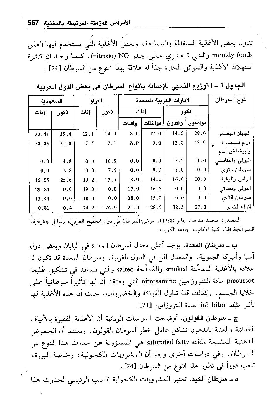 ج- سرطان القولون: أوضحت الدراسات الوبائية أن الأغذية الفقيرة بالألياف الغذائية والغنية بالدهون تشكل عامل خطر لسرطان القولون. ويعتقد أن الحموض الدهنية المشبعة saturated fatty acids هي المسؤولة عن حدوث هذا النوع من السرطان. وفي دراسات أخرى وجد أن المشروبات الكحولية، وخاصة البيرة، تلعب دورا في تطور هذا النوع من السرطان [24] .