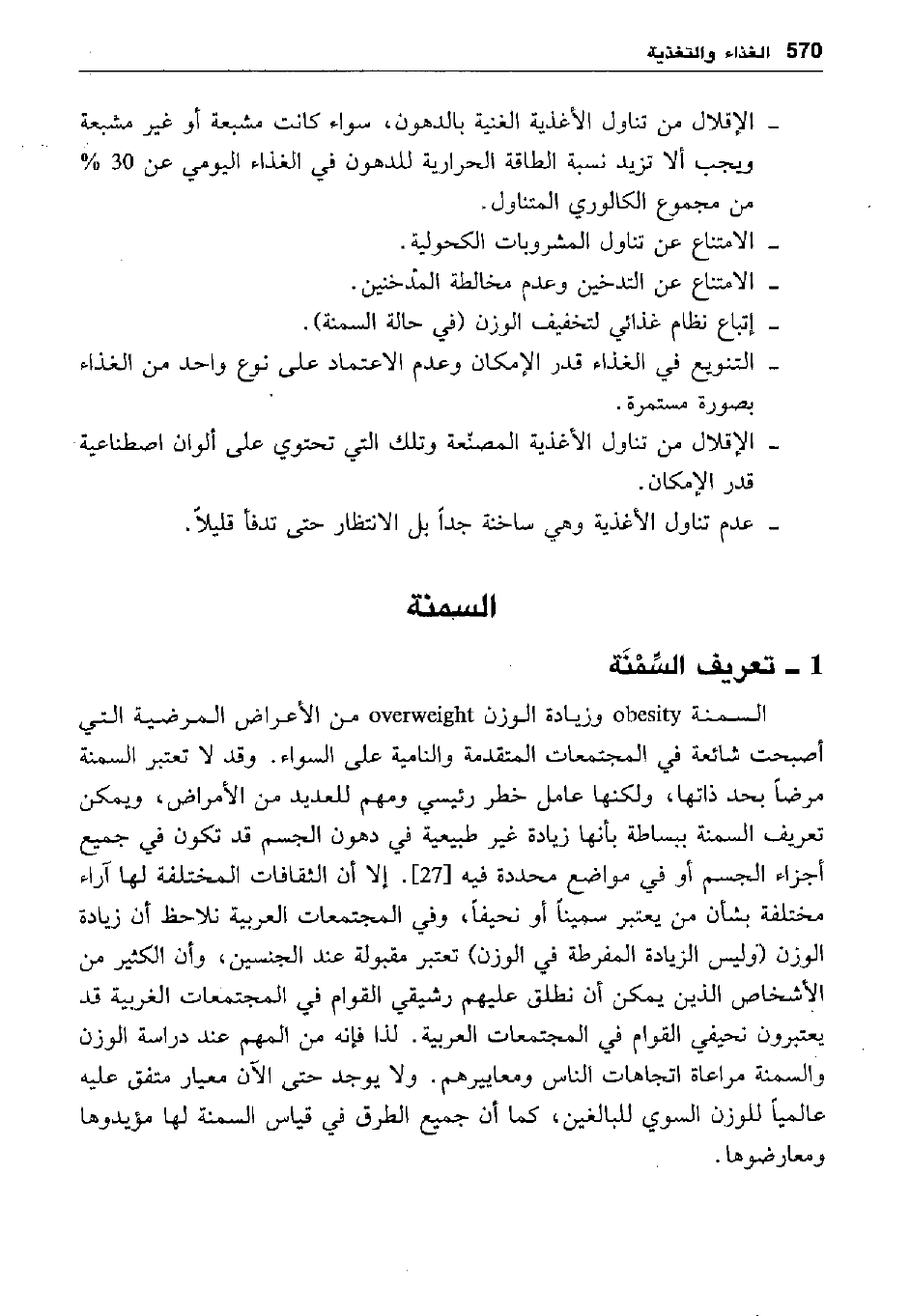 السمنة obesity وزيادة الوزن overweight من الأعراض المرضية التي أصبحت شائعة في المجتمعات المتقدمة والنامية على السواء. وقد لا تعتبر السمنة مرضا بحد ذاتها، ولكنها عامل خطر رئيسي ومهم للعديد من الأمراض، ويمكن تعريف السمنة ببساطة بأنها زيادة غير طبيعية في دهون الجسم قد لا تكون في جميع أجزاء الجسم أو في مواضع محددة فيه [27] . إلا أن الثقافات المختلفة لها آراء مختلفة بشأن من يعتبر سمينا أو نحيفا، وفي المجتمعات العربية نلاحظ أن زيادة الوزن "وليس الزيادة المفرطة في الوزن" تعتبر مقبولة عند الجنسين، وأن الكثير من الأشخاص الذين يمكن أن نطلق عليهم رشيقي القوام في المجتمعات الغربية قد يعتبرون نحيفي القوام في المجتمعات العربية. لذا فإنه من المهم عند دراسة الوزن والسمنة مراعاة اتجاهات الناس ومعاييرهم. ولا يوجد حتى الآن معيار متفق عليه عالميا للوزن السوي للبالغين، كما أن جميع الطرق في قياس السمنة لها مؤيدوها ومعارضوها.