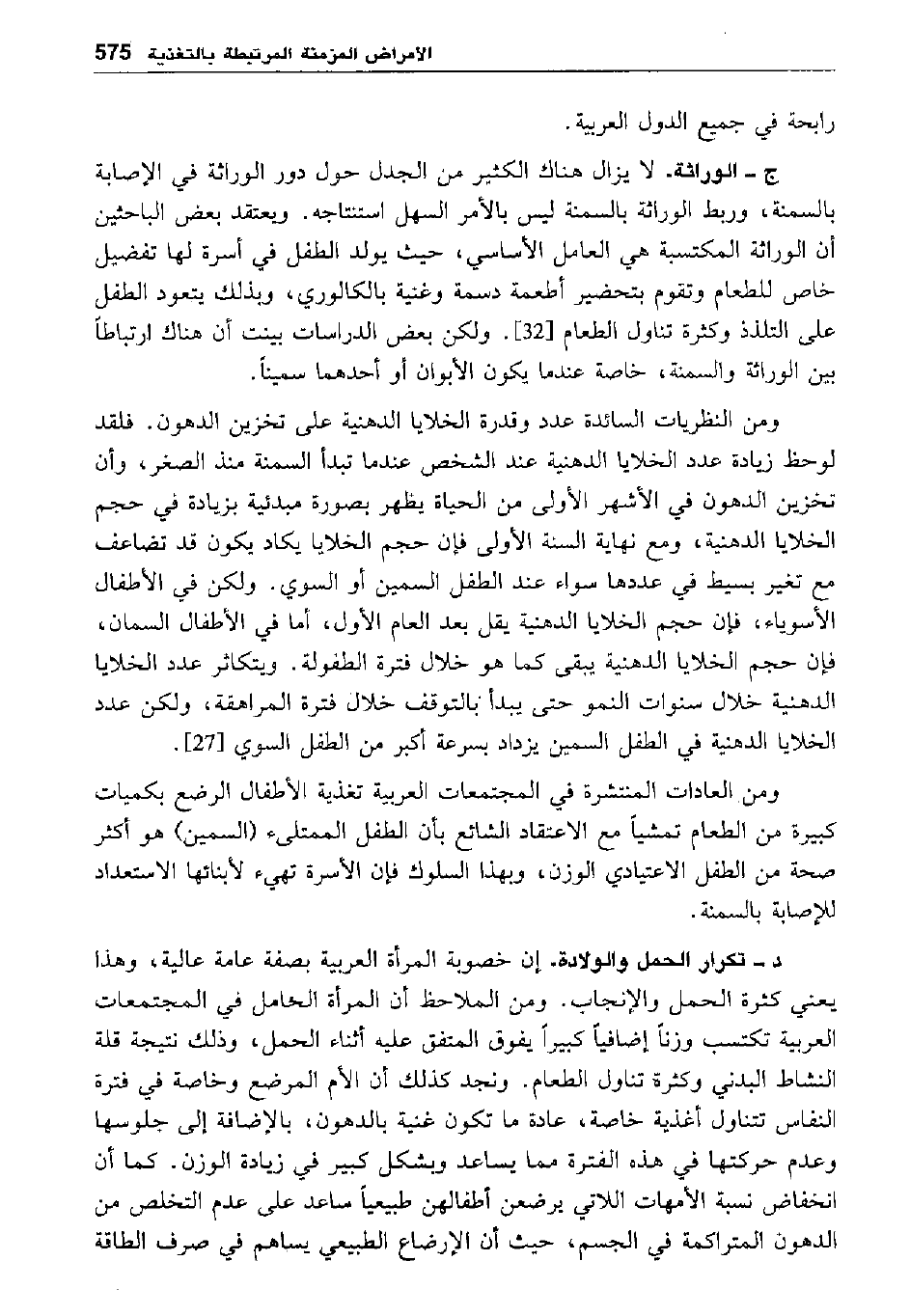 د- تكرار الحمل والولادة: إن خصوبة المرأة العربية بصفة عامة عالية، وهذا يعني كثرة الحمل والإنجاب. ومن الملاحظ أن المرأة الحامل في المجتمعات العربية تكتسب وزنا إضافيا كبيرا يفوق المتفق عليه أثناء الحمل، وذلك نتيجة قلة النشاط البدني وكثرة تناول الطعام. ونجد كذلك أن الأم المرضع وخاصة في فترة النفاس تتناول أغذية خاصة، عادة ما تكون غنية بالدهون، بالإضافة إلى جلوسها وعدم حركتها في هذه الفترة مما يساعد وبشكل كبير في زيادة الوزن. كما أن انخفاض نسبة الأمهات اللاتي يرضعن أطفالهن طبيعيا ساعد في عدم التخلص من الدهون المتراكمة في الجسم، حيث أن الإرضاع يساهم في صرف الطاقة