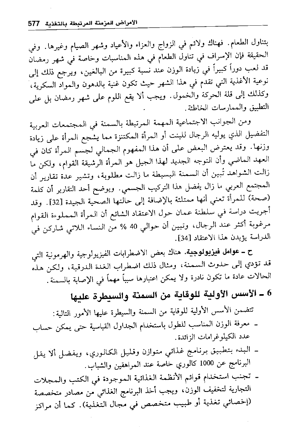 ومن الجوانب الاجتماعية المهمة المرتبطة بالسمنة في المجتمعات العربية التفضيل الذي يوليه الرجال للبنت أو المرأة المكتنزة مما يجشع المرأة على زيادة وزنها. وقد يعترض البعض على أن هذا المفهوم الجمالي لجسم المرأة كان في العهد الماضي وأن التوجه الجديد لهذا الجيل هو المرأة الرشيقة القوام، ولكن ما زالت الشواهد تبين أن السمنة البسيطة ما زالت مطلوبة، وتشير عدة تقارير أن المجتمع العربي ما زال يفضل هذا التركيب الجسمي، ويوضح أحد التقارير أن كلمة "صحة" للمرأة تعني أنها ممتلئة بالإضافة إلى حالتها الصحية الجيدة [32] . وقد أجريت دراسة في سلطنة عمان حول الاعتقاد الشائع أن المرأة المملوءة القوام مرغوبة أكثر عند الرجال، وتبين أن حوالي 40% من النساء اللاتي شاركن في الدراسة يؤيدون هذا الاعتقاد [34] .