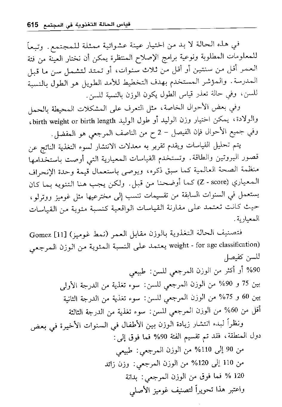 فتصنيف الحالة التغذوية بالوزن مقابل العمر "نمط غوميز" [11] Gomez weight - for age classifcation يعتمد على النسبة المئوية من الوزن المرجعي للسن كفيصل.