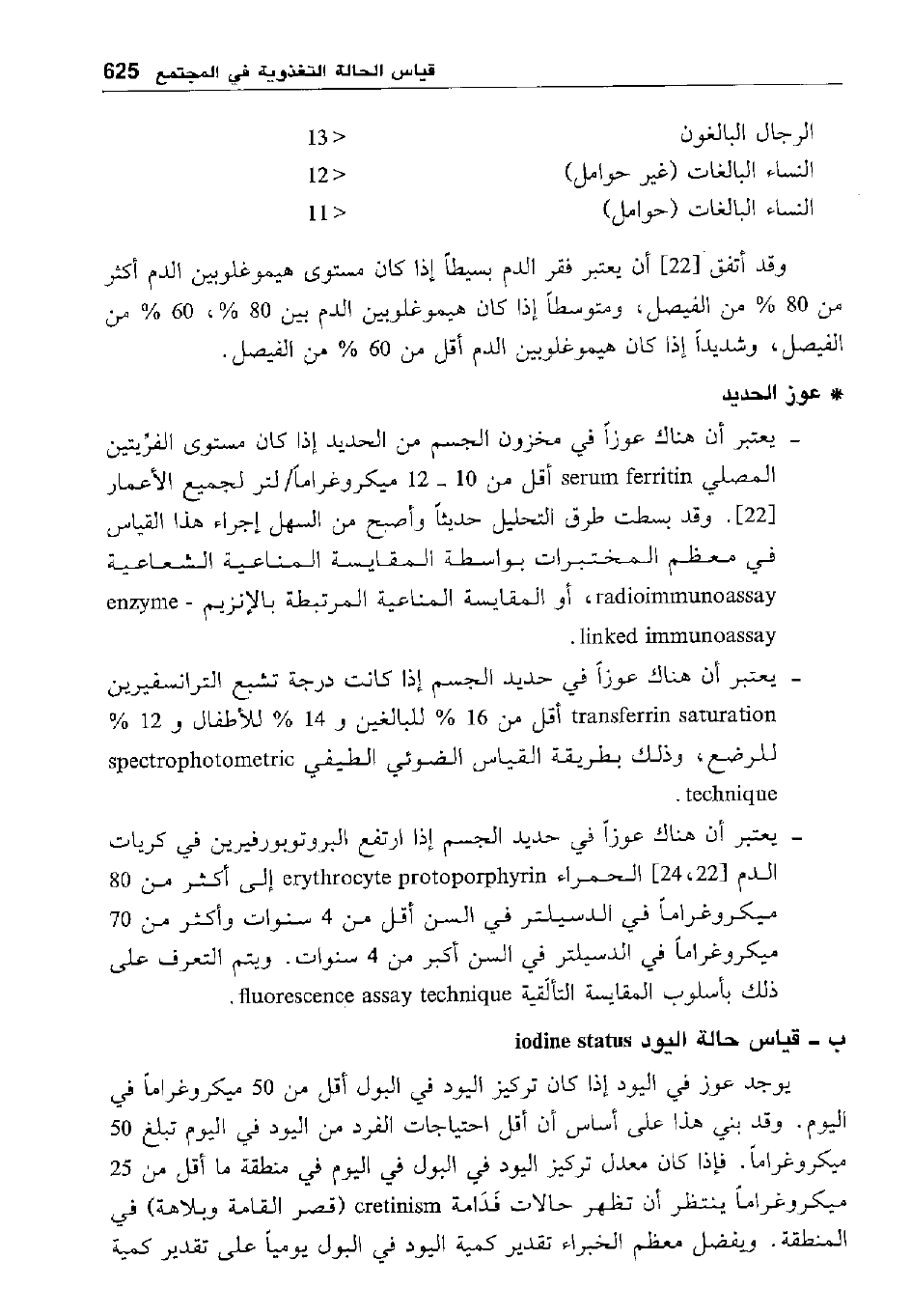 - يعتبر أن هناك عوزا في حديد الجسم إذا ارتفع البروتوبورفيرين في كريات الدم [22، 24] الحمراء erythrocyte protopotphyrin إلى أكثر من 80 ميكروغراما في الدسيلتر في السن أقل من 4 سنوات وأكثر من 70 ميكروغراما في الدسيلتر في السن أكبر من 4 سنوات. ويتم التعرف على ذلك بأسلوب المقايسة التألقية fuorescence assay technique