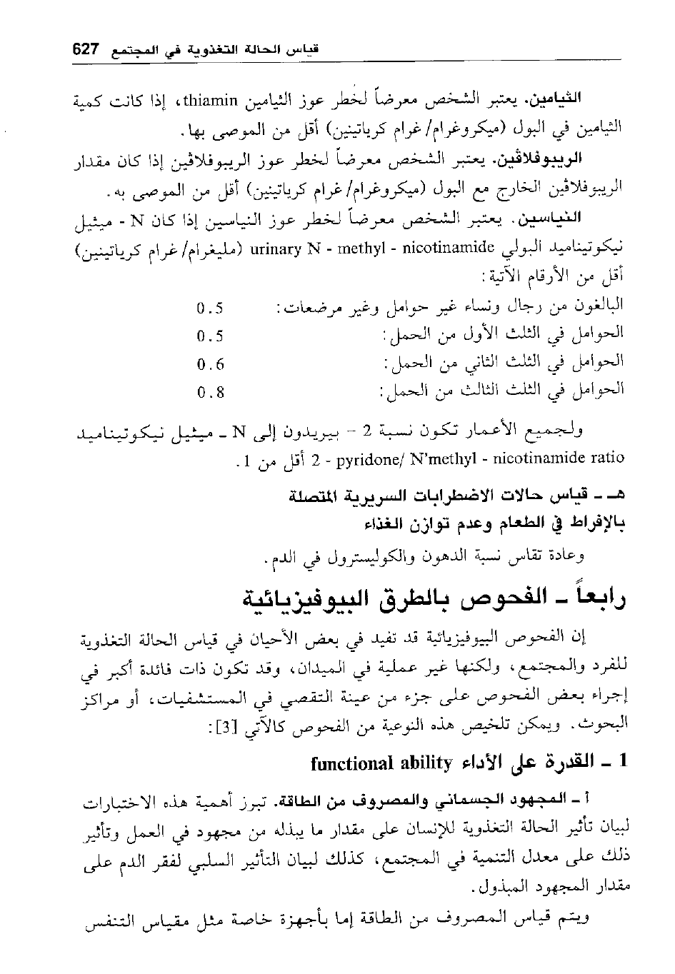 النياسين. يعتبر الشخص معرضا لخطر عوز النياسين إذا كان N- ميثيل نيكوتيناميد البولي urinary N- methyl- nicotinamide "مليغرام/ غرام كرياتينين" أقل من الأرقام الآية: