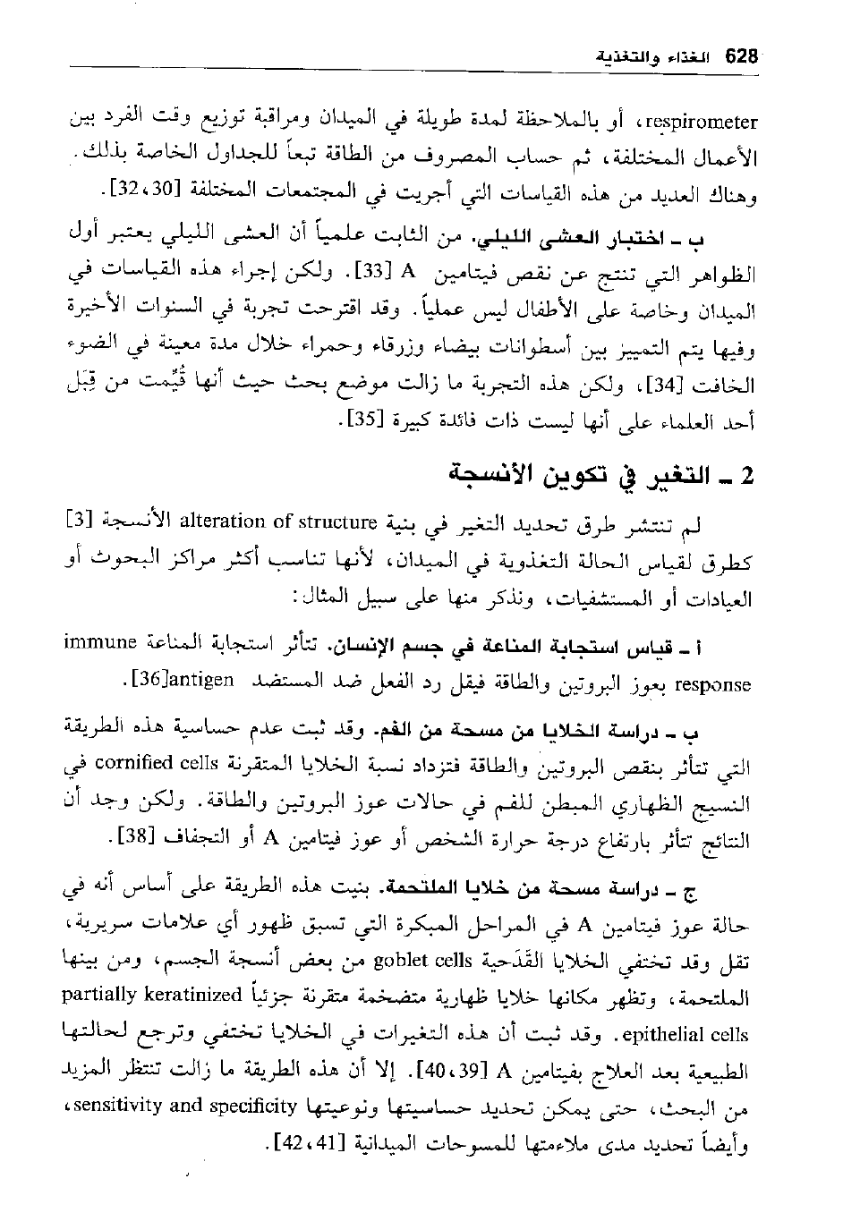 ج- دراسة مسحة من خلايا الملتحمة. بنيت هذه الطريقة على أساس أنه في حالة عوز فيتامين A في المراحل المبكرة التي تسبق ظهور أي علامات سريرية، تقل وقد تختفي الخلايا القدحية goblet cells من بعض أنسجة الجسم، ومن بينها الملتحمة، وتظهر مكانها خلايا ظهارية متضخمة متقرنة جزئيا partially keratinized epitheleal cells. وقد ثبت أن هذه التغيرات في الخلايا تختفي وترجع لحالتها الطبيعية بعد العلاج بفيتامين A [39، 40] . إلا أن هذه الطريقة ما زالت تنتظر المزيد من البحث، حتى يمكن تحديد حساسيتها ونوعيتها sensitivity and specificity وأيضا تحديد مدى ملاءمتها للمسوحات الميدانية [41، 42] .