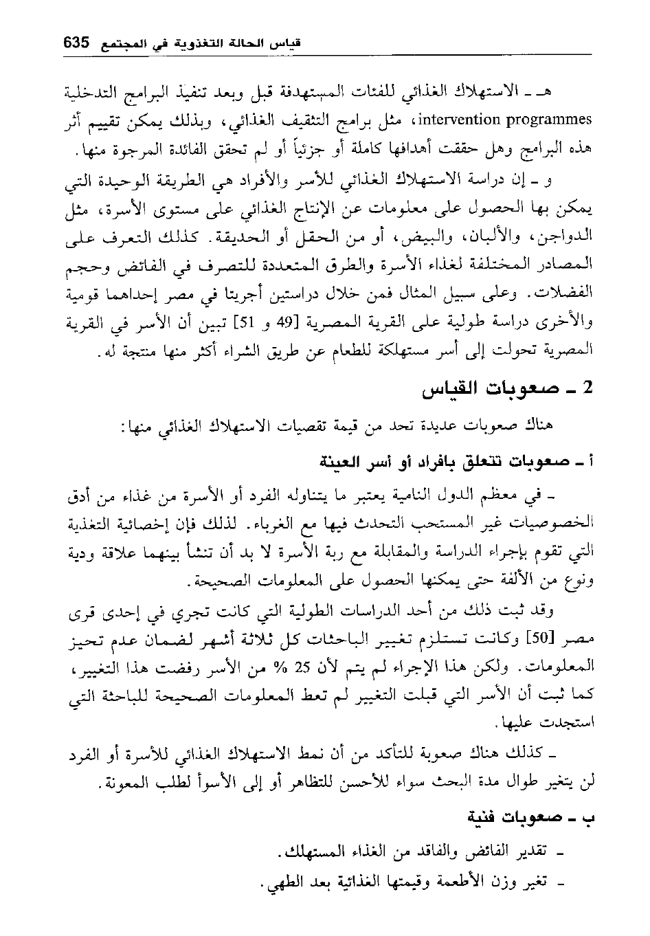 هـ- الاستهلاك الغذائي للفئات المستهدفة قبل وبعد تنفيذ البرامج التدخلية intervention programmes، مثل برامج التثقيف الغذائي، وبذلك يمكن تقييم أثر هذه البرامج وهل حققت أهدافها كاملة أو جزئيا أو لم تحقق الفائدة المرجوة منها.