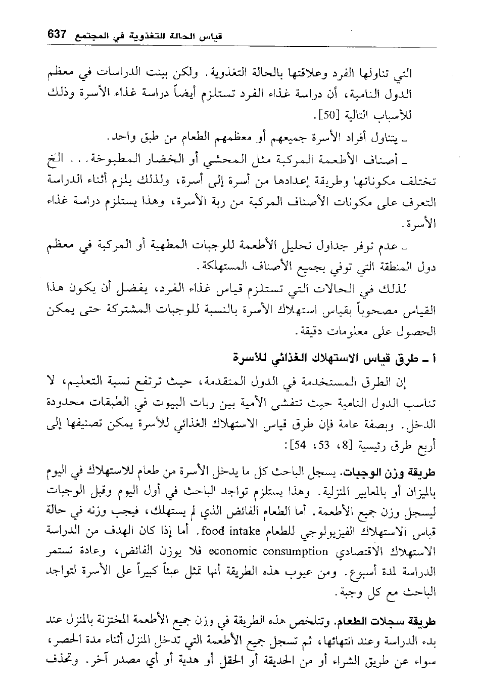 التي تناولها الفرد وعلاقتها بالحالة التغذوية. ولكن بينت الدراسات في معظم الدول النامية، أن دراسة غذاء الفرد تستلزم أيضا دراسة غذاء الأسرة وذلك للأسباب التالية [50] .