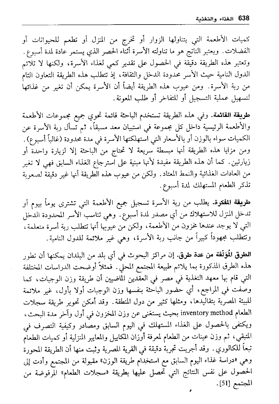 الطرق المولفة من عدة طرق. إن مراكز البحوث في أي بلد من البلدان يمكنها أن تطور هذه الطرق المذكورة بما يلائم طبيعة المجتمع المحلي. فمثلا أوضحت الدراسات المختلفة التي قام بها معهد التغذية في مصر في العقدين الماضيين أن طريقة وزن الوجبات، كما وصفت في المراجع، أي حضور الباحثة بنفسها وزن الوجبات أولا بأول، غير ملائمة للبيئة المصرية بتقاليدها، ومثلها كثير من دول المنطقة. وقد أمكن تحوير طريقة سجلات الطعام inventory method بحيث يستغنى عن وزن المخزون في أول وآخر مدة البحث، ويكتفى بالحصول على الغذاء المستهلك في اليوم السابق ومصادر وكيفية التصرف في المتبقي، ثم وزن عينات من الطعام لمعرفة أوزان المكاييل والمعايير المنزلية أو كميات الطعام تبعا للكالوري. وقد أجريت تجرية دقيقة في القرية المصرية وثبت منها أن الطريقة المحورة وهي "دراسة غذاء اليوم السابق مع استخدام طريقة الوزن" مقبولة من المجتمع وأدت إلى الحصول على نفس النتائج التي تحصل عليها بطريقة "سجلات الطعام" المرفوضة من المجتمع [51] .