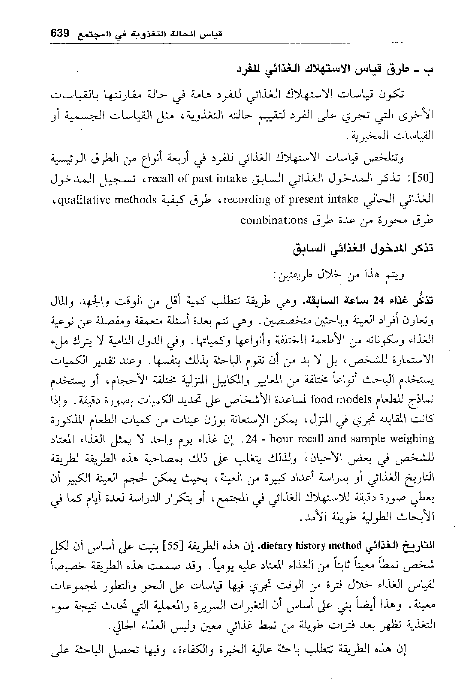 التاريخ الغذائي dietary history method إن هذه الطريقة [55] بنيت على أساس أن لكل شخص نمطا معينا ثابتا من الغذاء المعتاد عليه يوميا. وقد صممت هذه الطريقة خصيصا لقياس الغذاء خلال فترة من الوقت تجرى فيها قياسات على النمو والتطور لمجموعات معينة. وهذا أيضا بني على أساس أن التغيرات السريرية والمعملية التي تحدث نتيجة سوء التغذية تظهر بعد فترات طويلة من نمط غذائي معين وليس الغذاء الحالي.