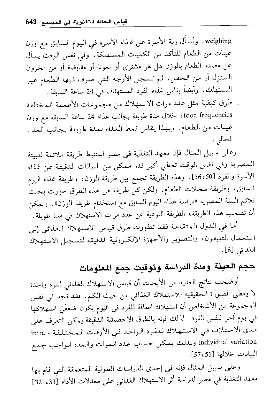 وعلى سبيل المثال فإن معهد التغذية في مصر استنبط طريقة ملائمة للبيئة المصرية وفي نفس الوقت تعطي أكبر قدر ممكن من البيانات الدقيقة عن غذاء الأسرة والفرد [50، 56] . وهذه الطريقة تجمع بين طريقة الوزن، وطريقة غذاء اليوم السابق، وطريقة سجلات الطعام. ولكن كل طريقة من هذه الطرق حورت بحيث تلائم البيئة المصرية "دراسة غذاء اليوم السابق مع استخدام طريقة الوزن". ويمكن أن تصحب هذه الطريقة، الطريقة النوعية عن عدة مرات الاستهلاك في مدة طويلة.