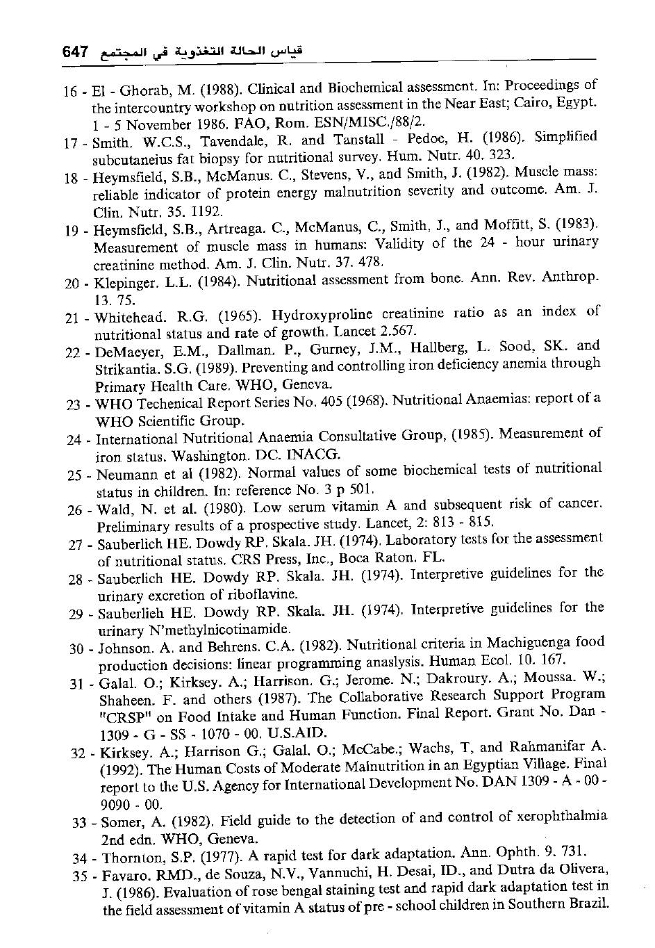 16 - El - Ghorab, M. (1988) . Clinical and Biochemical assessment. In: Proceedings of the intercountry workshop on nutrition assessment in the Near East; Cairo, Egypt. 1 - 5 November 1986. FAO, Rom. ESN/MISC./88/2.