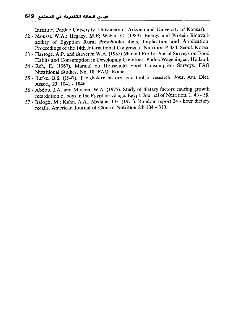 52 - Moussa W.A.; Hegazy. M.E; Weber. C. (1989) . Energy and Protein Bioavail-ability of Egyptian Rural Preschooler diets, Implication and Application. Proceedings of the 14th International Congress of Nutrition P 384. Seoul. Korea.
