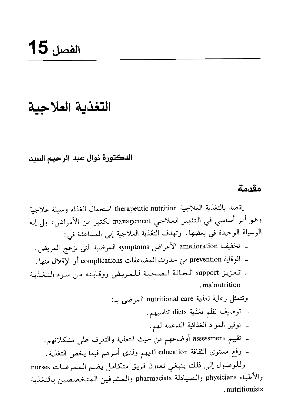 يقصد بالتغذية العلاجية th erapeutic nutuition استعمال الغذاء وسيلة علاجية وهو أمر أساسي في التدبير العلاجي management لكثير من الأمراض، بل إنه الوسيلة الوحيدة في بعضها. وتهدف التغذية إلى المساعدة في: