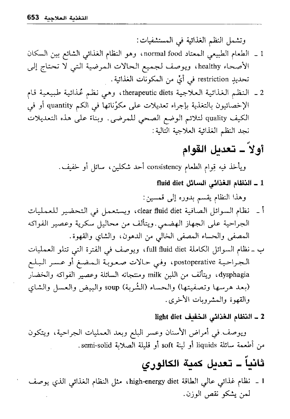 ب- نظام السوائل الكاملة full fluid diet، ويوصف في الفترة التي تتلو العمليات الجراحية postoperative، وفي حالات صعوبة المضغ أو عسر البلغ dysphagia، ويتألف من اللبن milk ومنتجاته السائلة وعصير الفواكه والخضار "بعد هرسها وتصفيتها" والحساء "الشربة" soup والبيض والعسل والشاي والقهوة والمشروبات الأخرى.