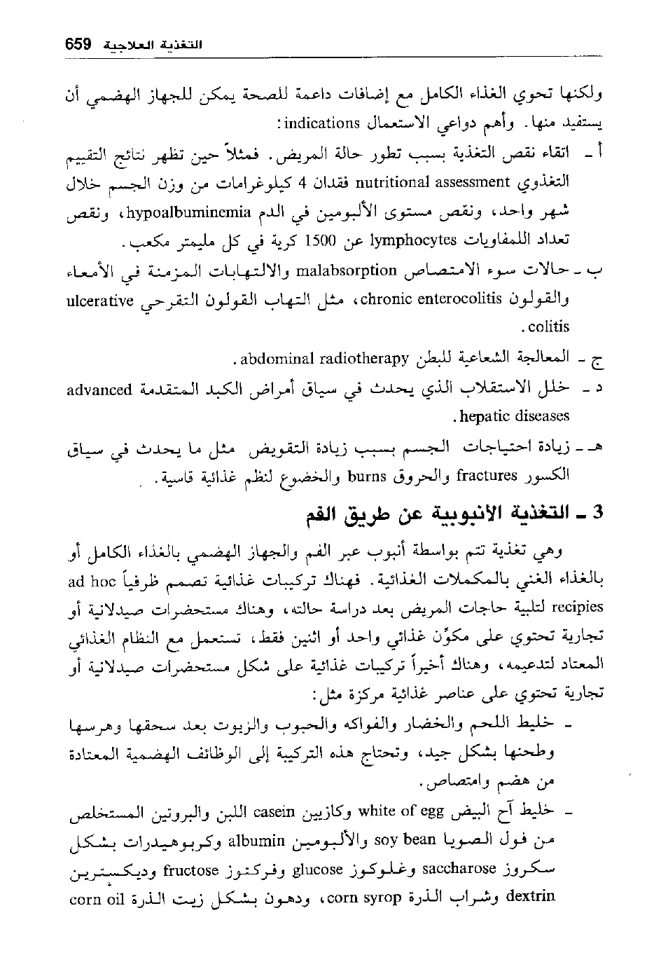 أ- اتقاء نقص التغذية بسبب تطور حالة المريض: فمثلا حين تظهر نتائج التقييم التغذوي nutretional assessment فقدان 4 كيلو غرامات من وزن الجسم خلال شهر واحد، ونقص مستوى الألبومين في الدم hypoalbuminemea، ونقص تعداد اللمفاويات lymhgocytes عن 1500 كرية في كل مليمتر مكعب.