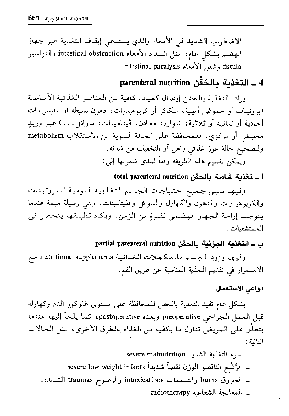 أ- تغذية شاملة بالحقن total parenteral nutrition