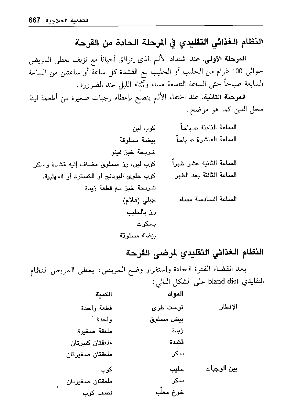 بعد انقضاء الفترة الحادة واستقرار وضع المريض، يعطى المريض النظام التقليدي bland diet على الشكل التالي: