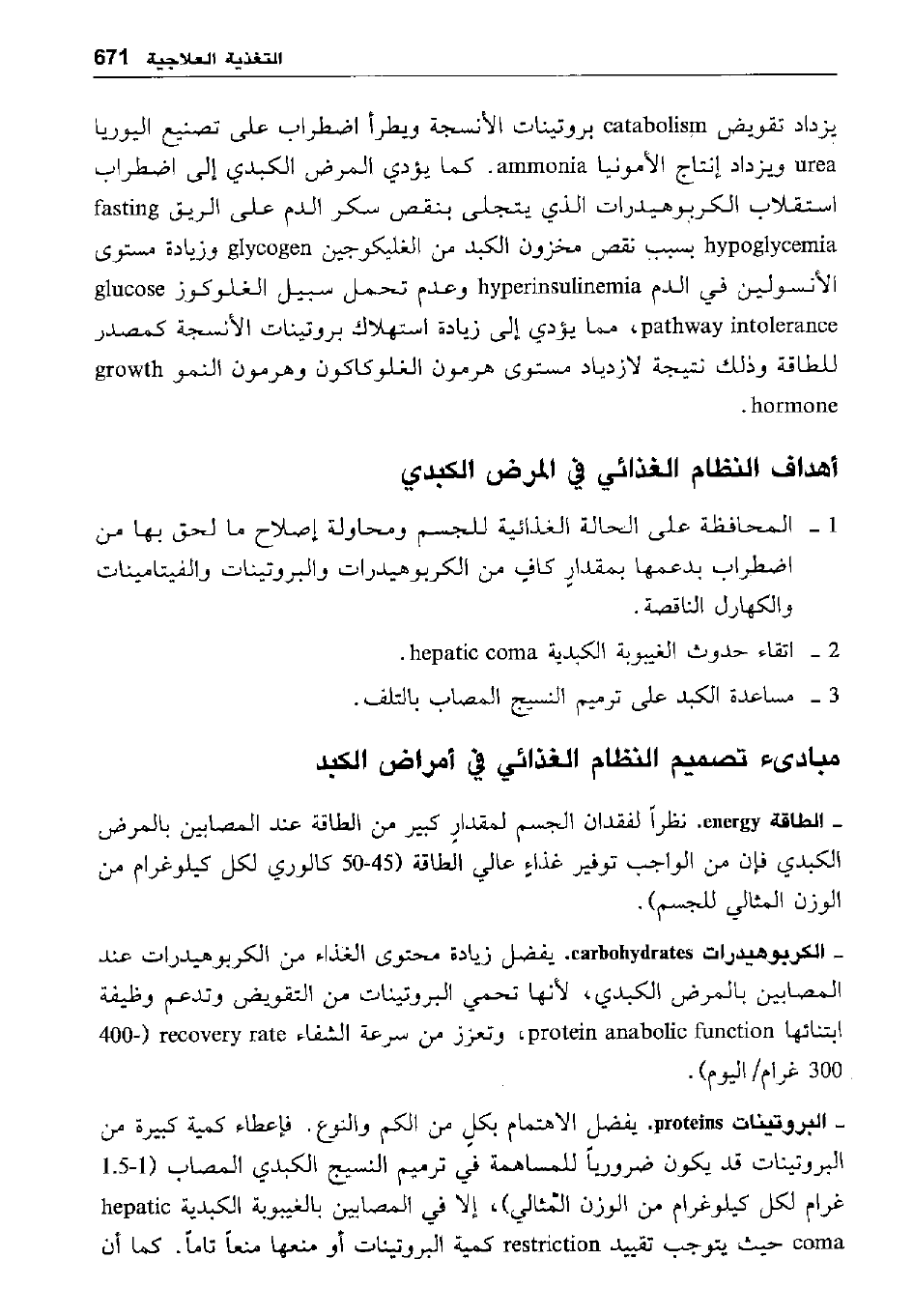 - الطاقة energy. نظرا لفقدان الجسم لمقدار كبير من الطاقة عند المصابين بالمرض الكبدي فإن الواجب توفير غذاءعالي الطاقة "45-50 كالوري لكل كيلو غرام من الوزن المثالي للجسم".