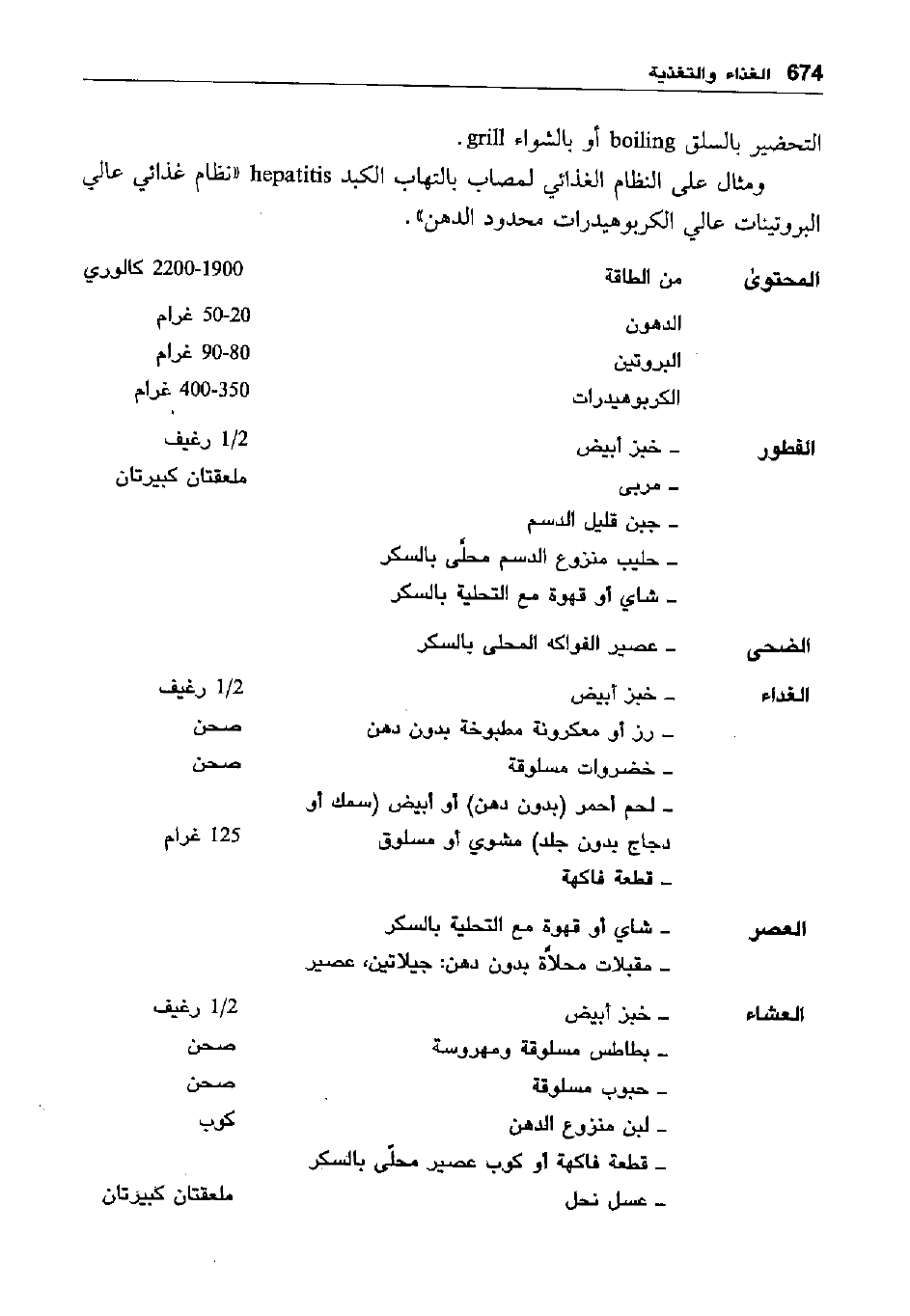 ومثال على النظام الغذائي لمصاب بالتهاب الكبد hepatitis "نظام غذائي عالي البروتينات عالي الكربوهيدرات محدود الدهن".