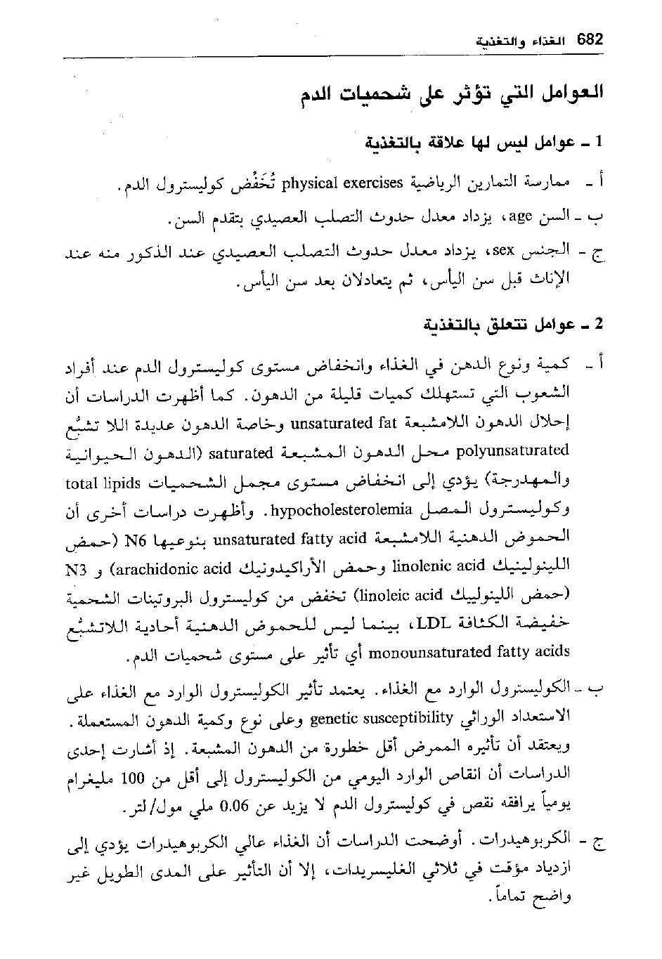 أ- كمية ونوع الدهن في الغذاء وانخفاض مستوى كوليسترول الدم عند أفراد الشعوب التي تستهلك كميات قليلة من الدهون. كما أظهرت الدراسات أن إحلال الدهون اللامشبعة unsaturated fat وخاصة الدهون عديدة اللا تشبع polyunsatururated محل الدهون المشبعة "الدهون الحيوانية والمهدرجة" يؤدي إلى انخفاض مستوى مجمل الشحميات total lipids وكوليسترول المصل hypocholesterolemia. وأظهرت دراسات أخرى أن الحموض الدهنية اللامشبعة unsaturated fatty acid بنوعيها N6 "حمض اللينولييك linoleic acid" وحمض الأراكيدونيك arachidonec acid وN3 "حمض اللينولييك linoleic acid" تخفض من كوليسترول البروتينات الشحمية خفيضة الكثافة LDL، بينما ليس للحموض الدهنية أحادية اللاتشبع monounsaturated fatty acids أي تأثير على مستوى شحميات الدم.