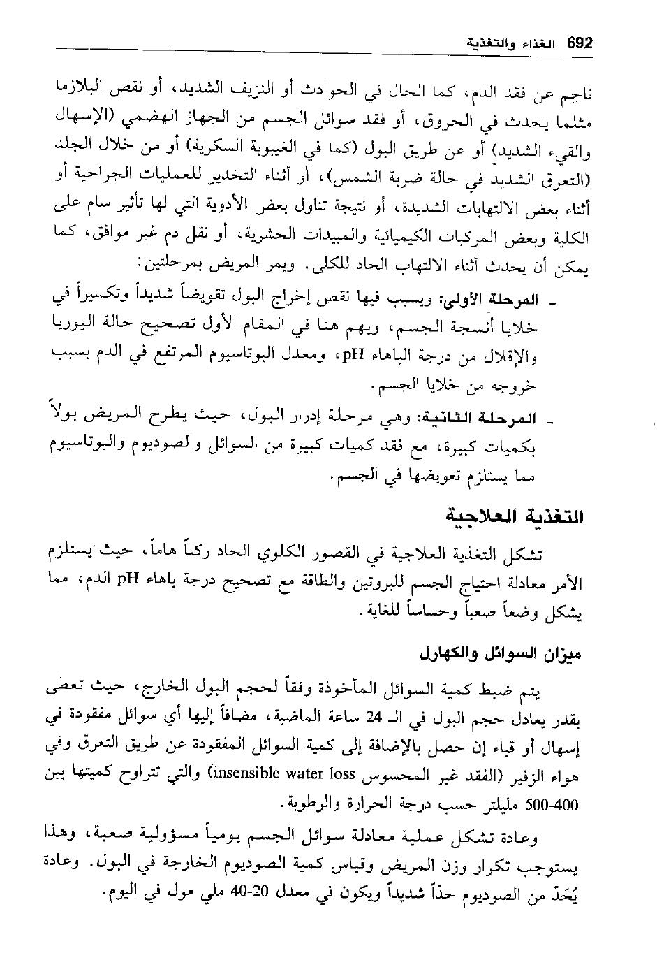 تشكل التغذية العلاجية في القصور الكلوي الحاد ركنا هاما، حيث يستلزم الامر معادلة احتياج الجسم للبروتين والطاقة مع تصحيح درجة باهاء pH الدم، مما يشكل وضعا صعبا وحساسا للغابة.