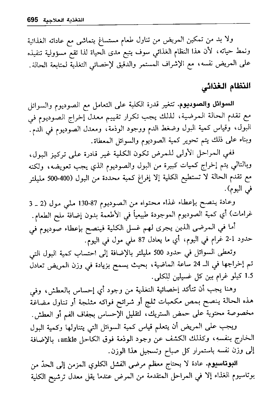 أما في المرضى الذين يجرى لهم غسل الكلية فينصح بإعطاء صوديوم في حدود 1-2 غرام في اليوم، أي ما يعادل 87 مملي مول في اليوم.