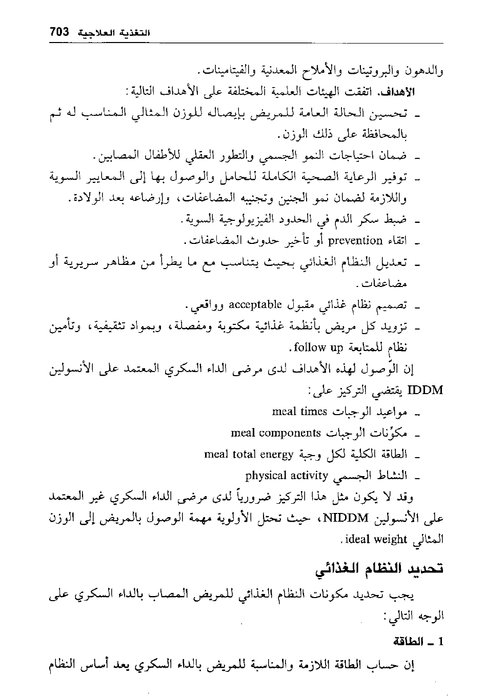 وقد لا يكون مثل هذا التركيز ضروريا لدى مرضى الداء السكري غير المعتمد على الأنسولين NlDDM، حيث تحتل الأولوية مهمة الوصول بالمريض إلى الوزن المثالي ideal weight.