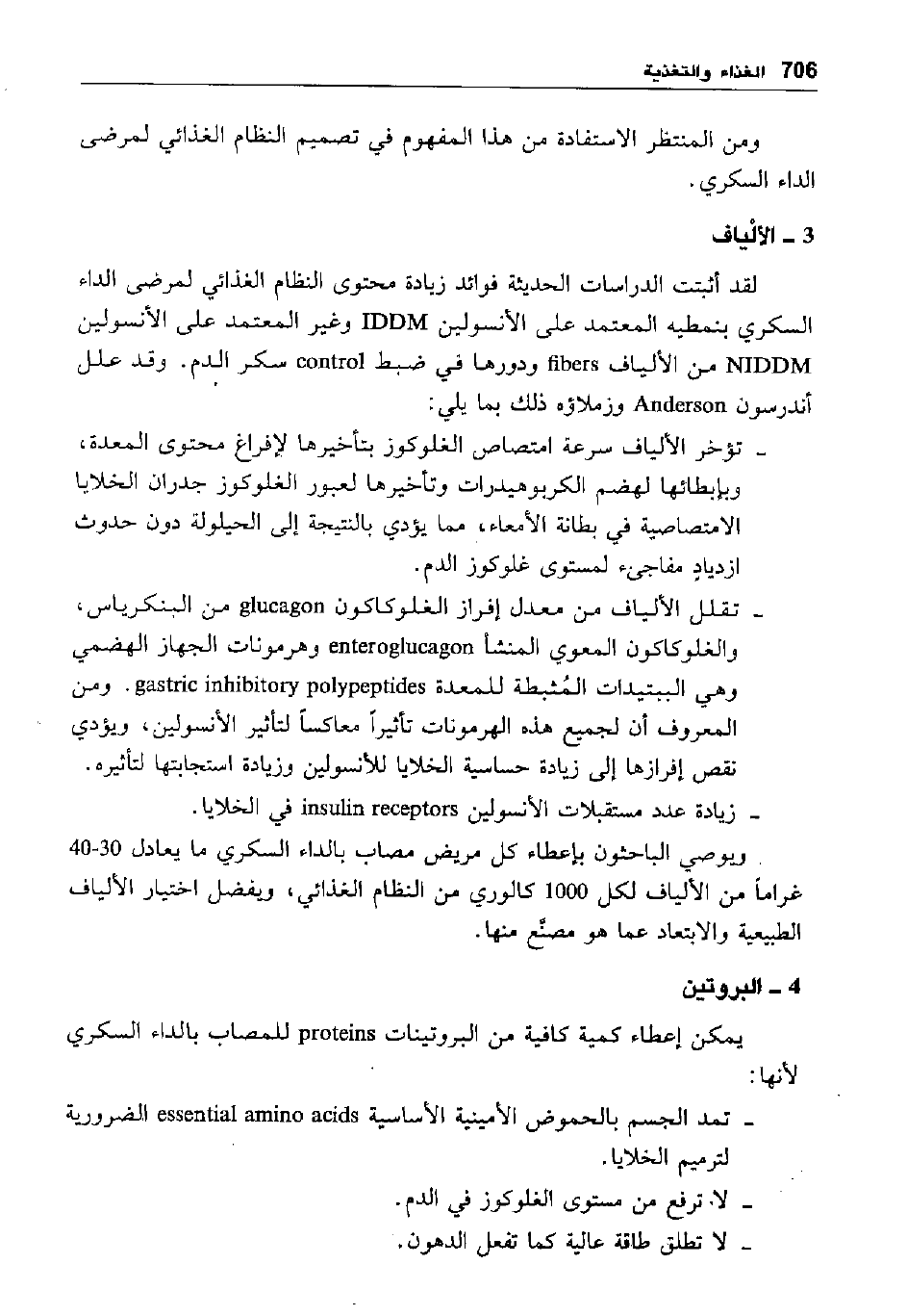لقد أثبتت الدراسات الحديثة فوائد زيادة محتوى النظام الغذائي لمرضى الداء السكري بنمطيه المعتمد على الأنسولين lDDM وغير المعتمد على الأنسولين lDDM من الألياف fbers ودورها في ضبط cotrol سكر الدم. وقد علل أندرسون Anderson وزملاؤه ذلك بما يلي: